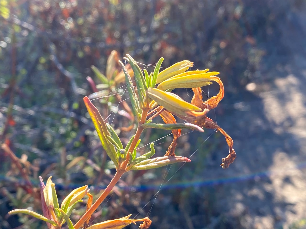 Backlit by the early morning sun, spider webs can be seen strung between the leaves and developing seed capsules of Sticky Monkeyflowers, Diplacus aurantiacus.