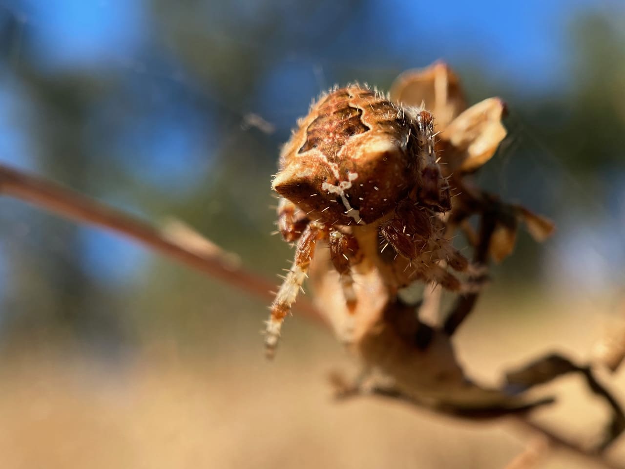 I stop briefly to say hello to the Two-tubercled Orb-weaver Spider, Gibbaranea bituberculata (family Araneidae) on her Soap Plant seed capsule.