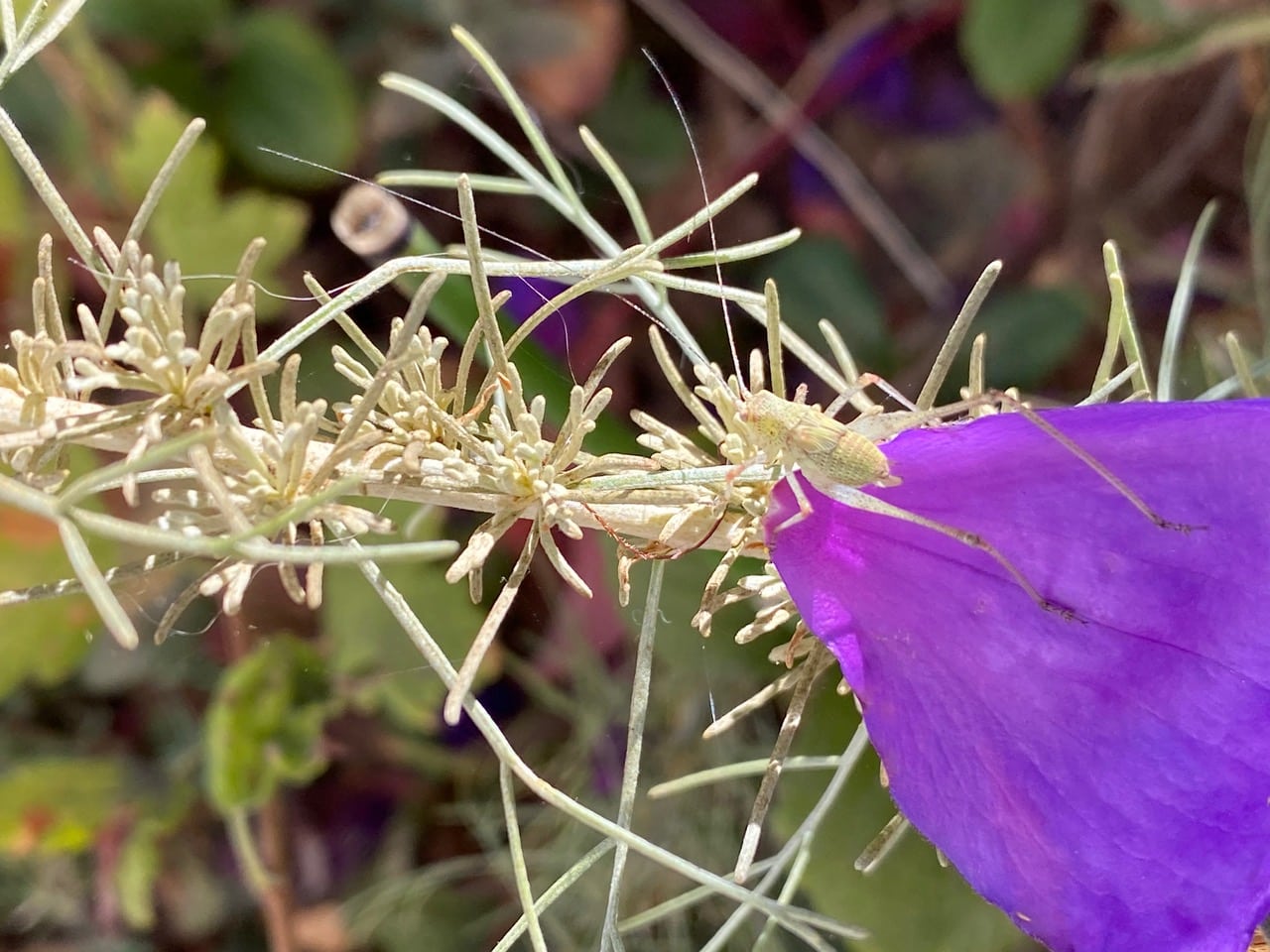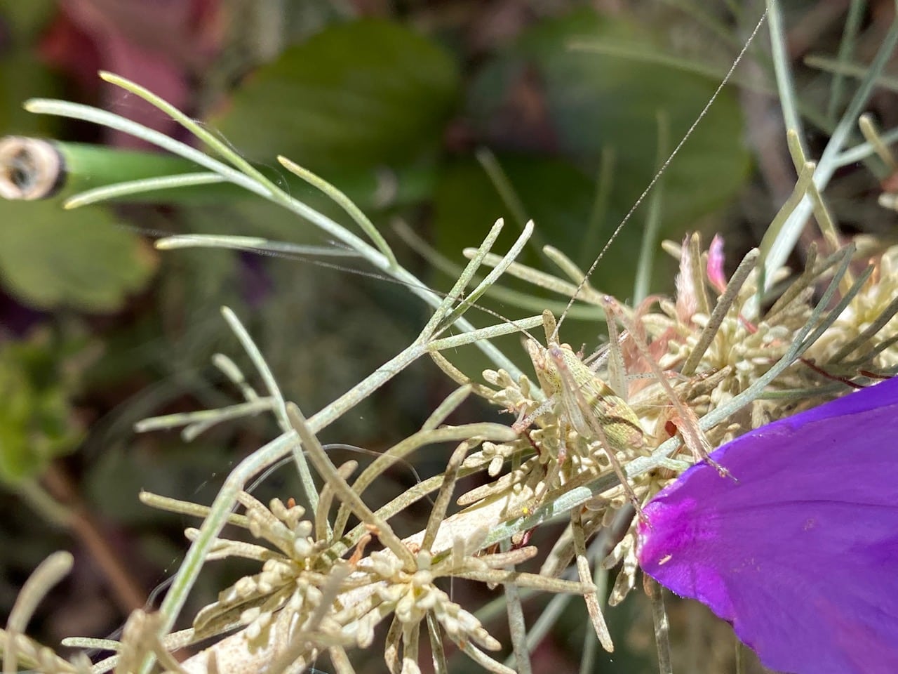 As I walk past a California Sage Brush, Artemisia californica, my eyes are drawn to a tiny, pale insect on a purple petal that has fallen on the shrub. It is a nymph of the Mediterranean Katydid, Phaneroptera nana (family Tettigoniidae).