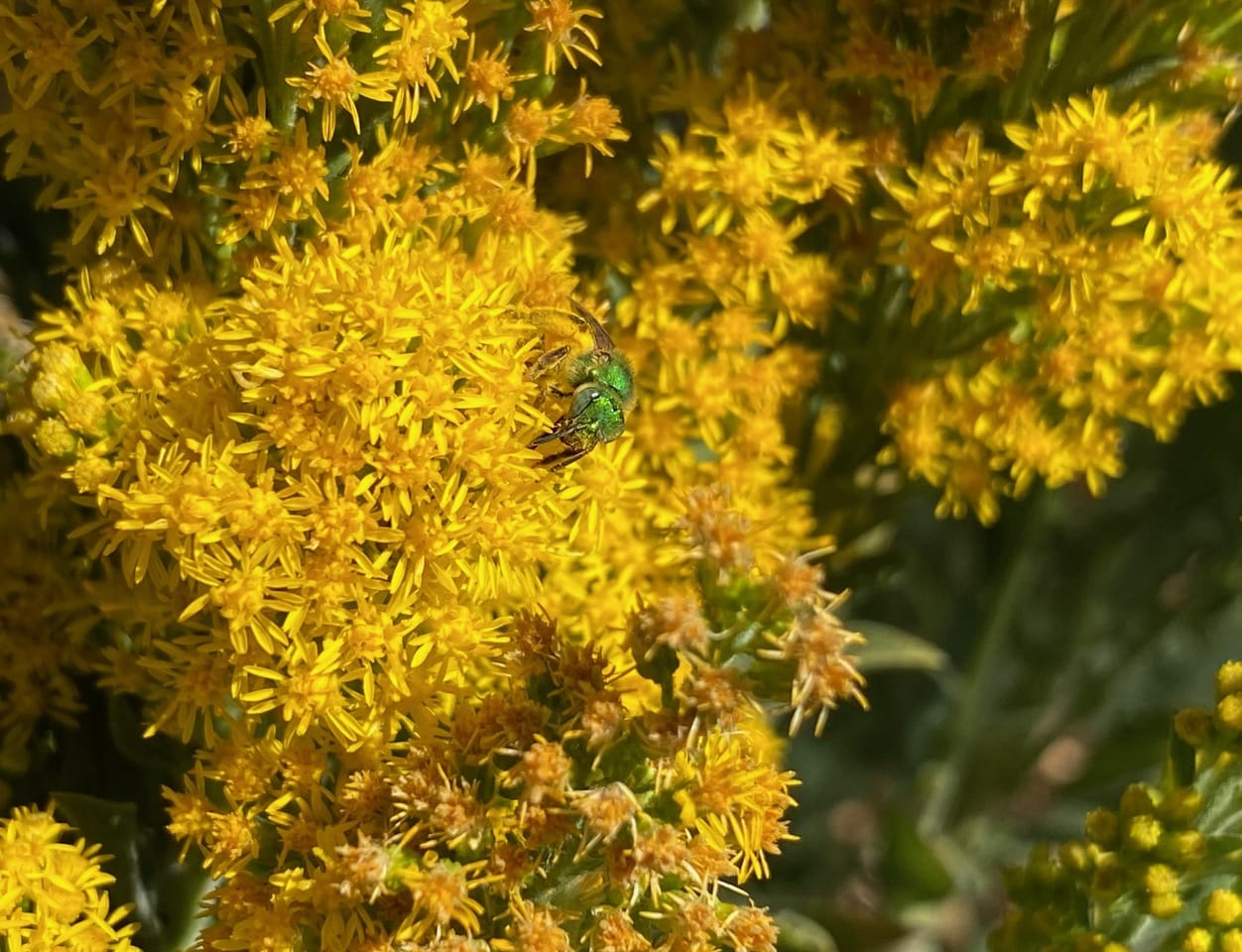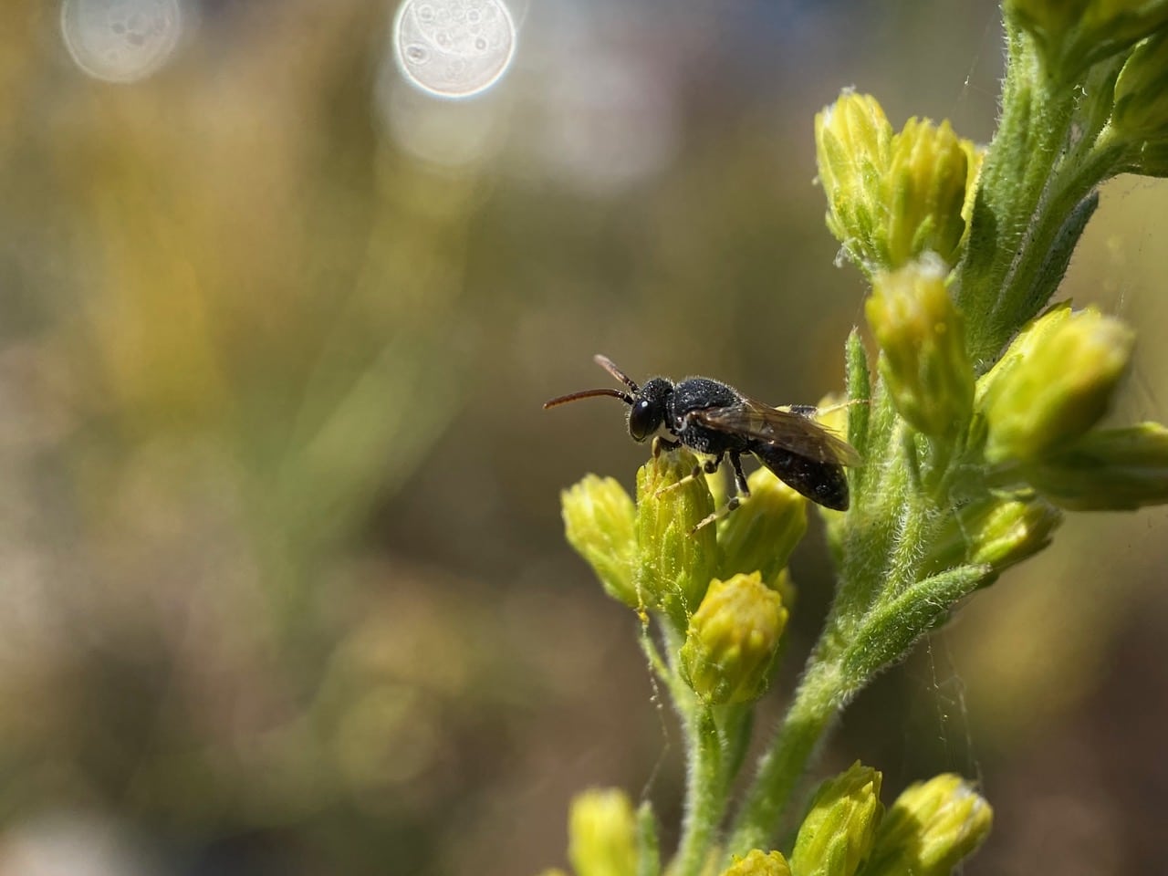 A Masked Bee, Hylaeus sp. (family Colletidae) is perched on the immature flowerheads of California Goldenrod.