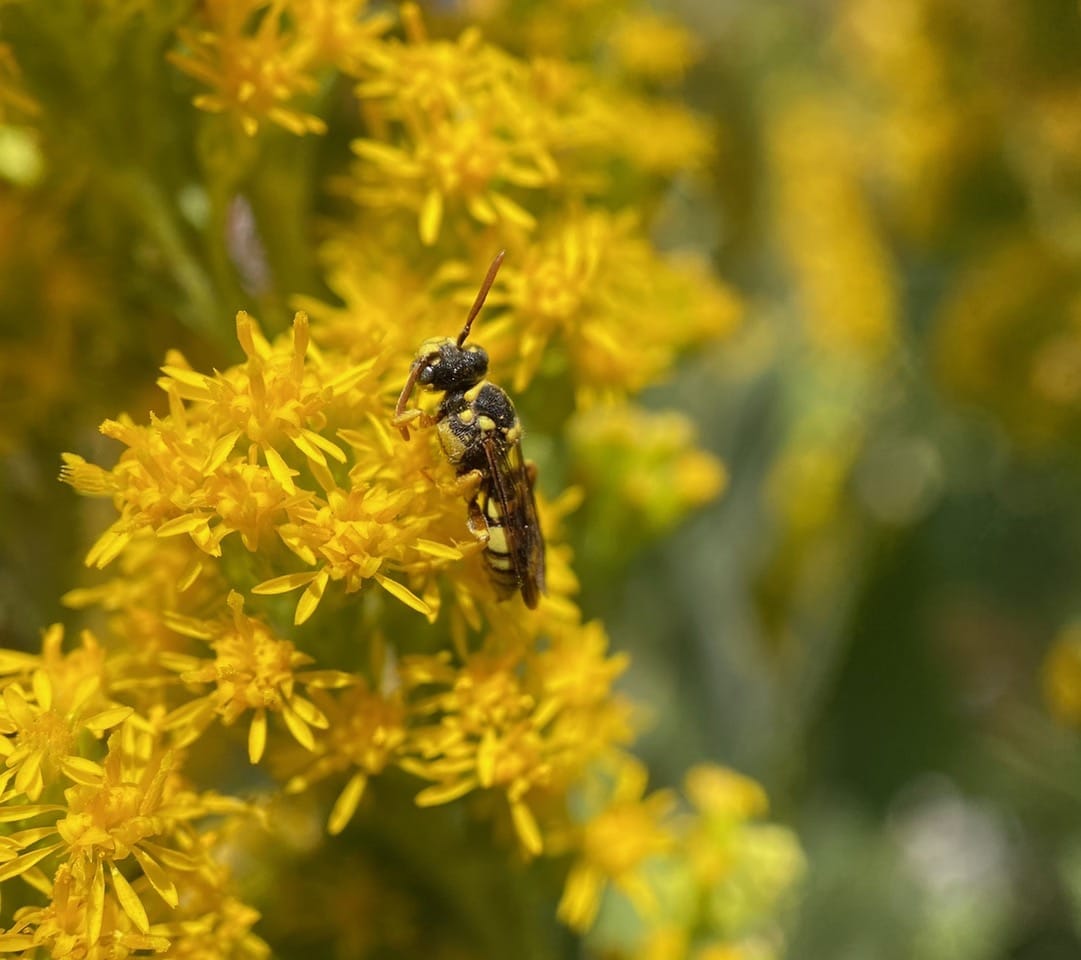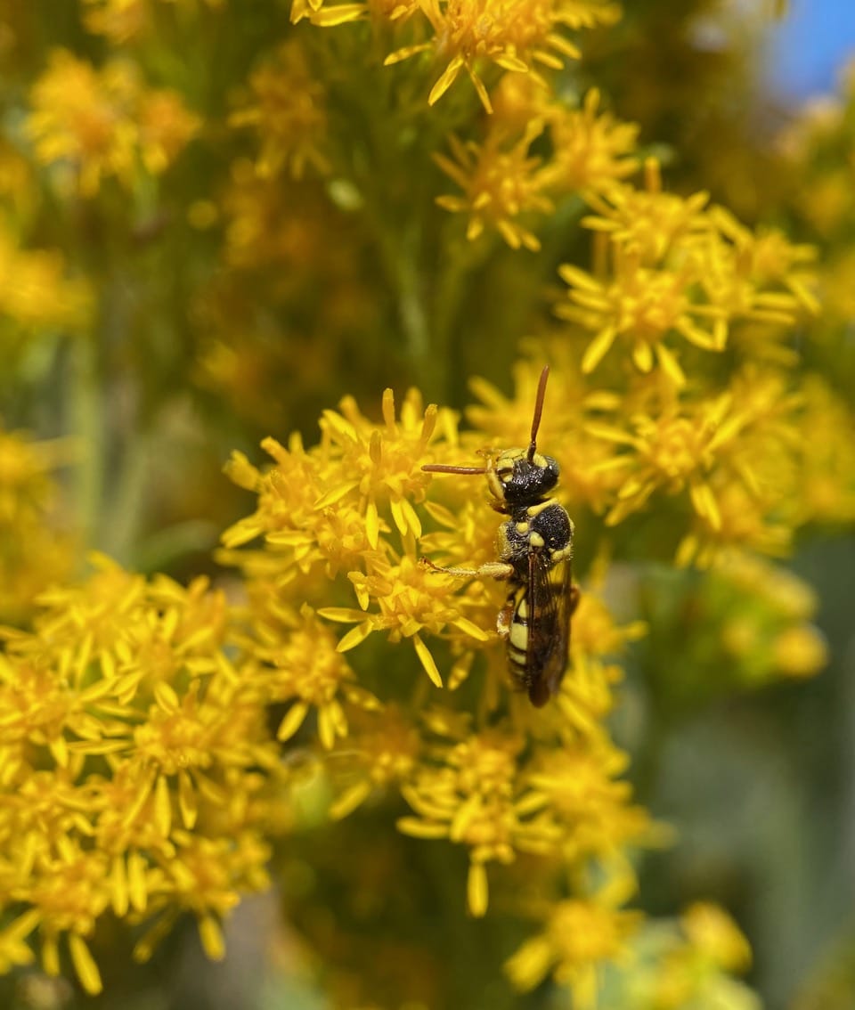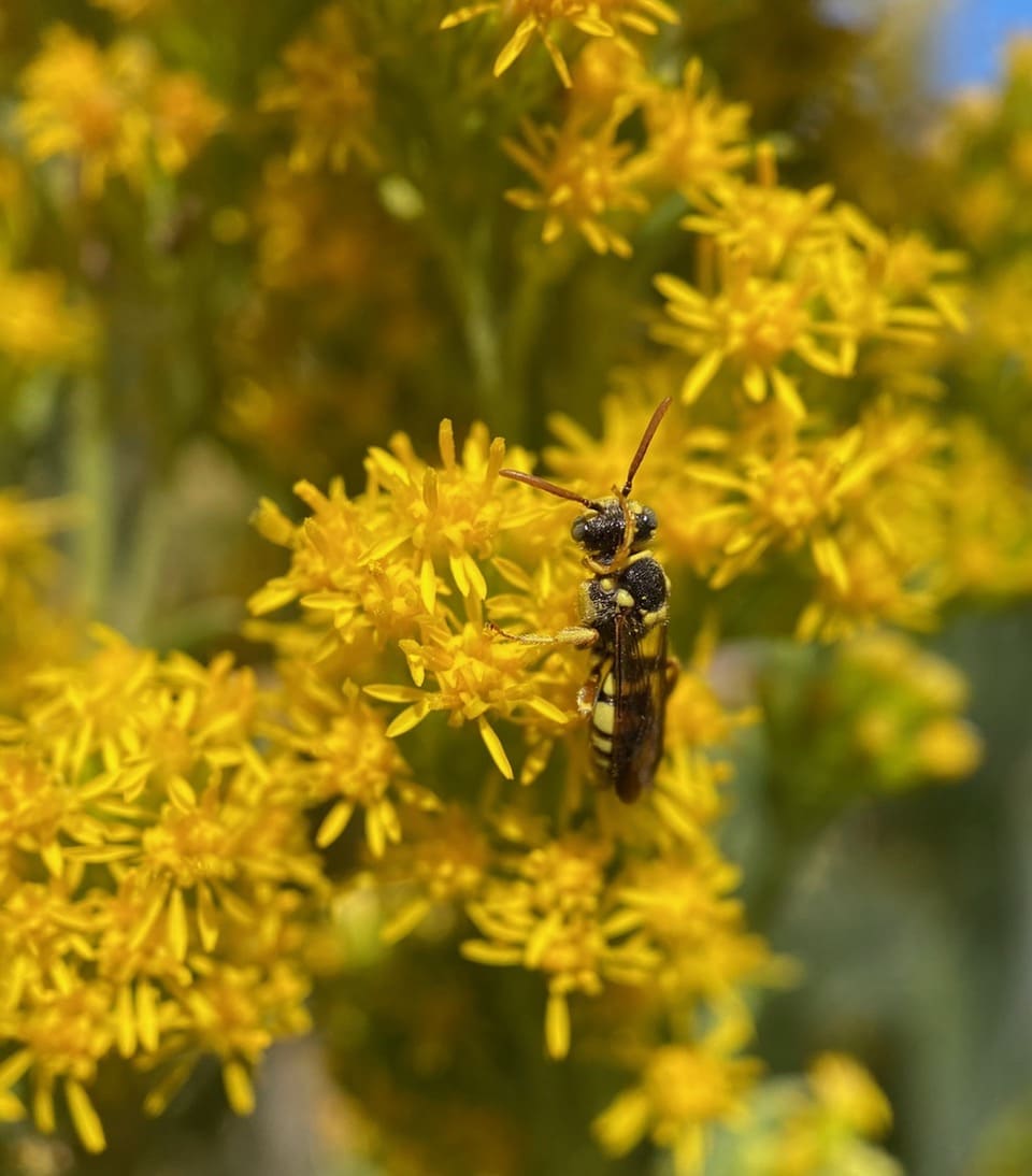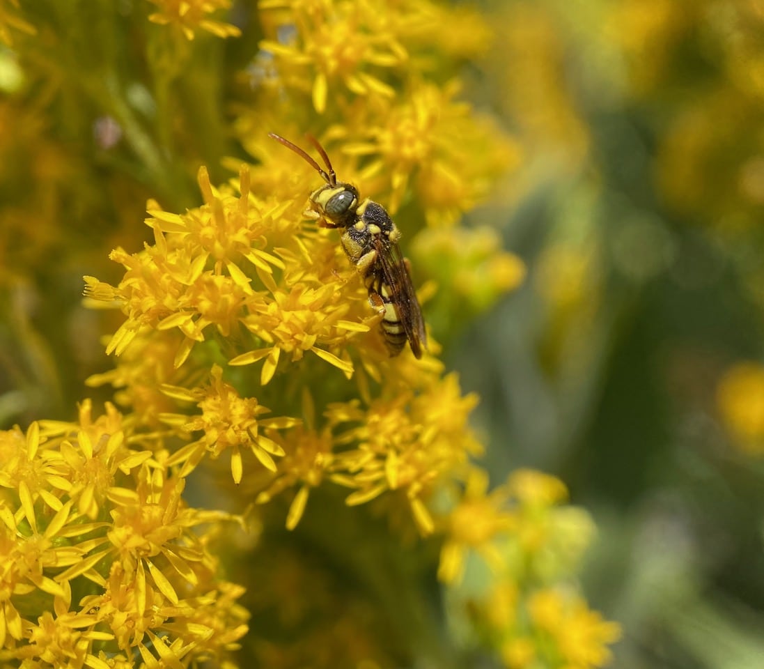 A Nomad Bee, Nomada sp. (family Apidae) is foraging on an inflorescence of California Goldenrod.