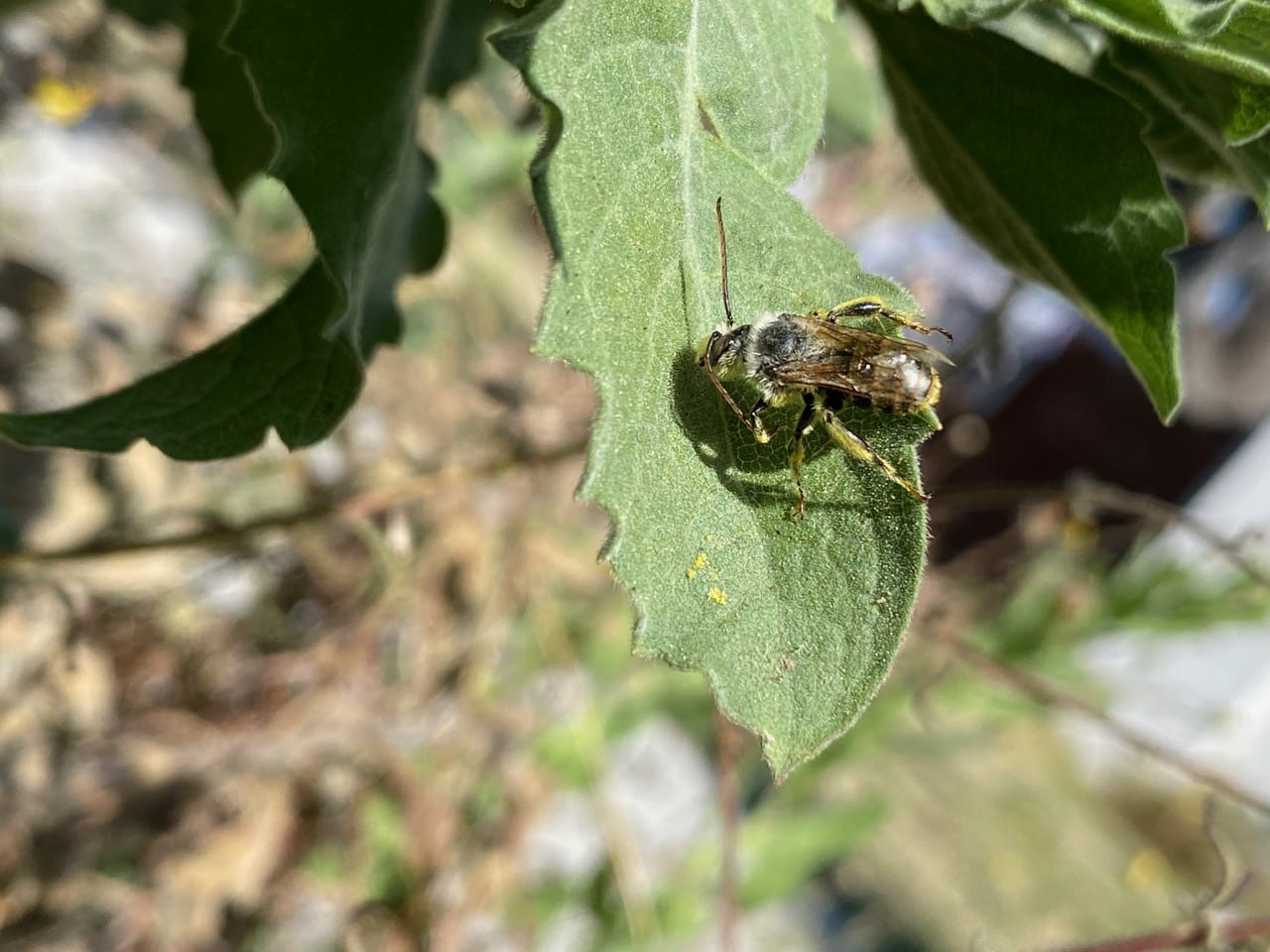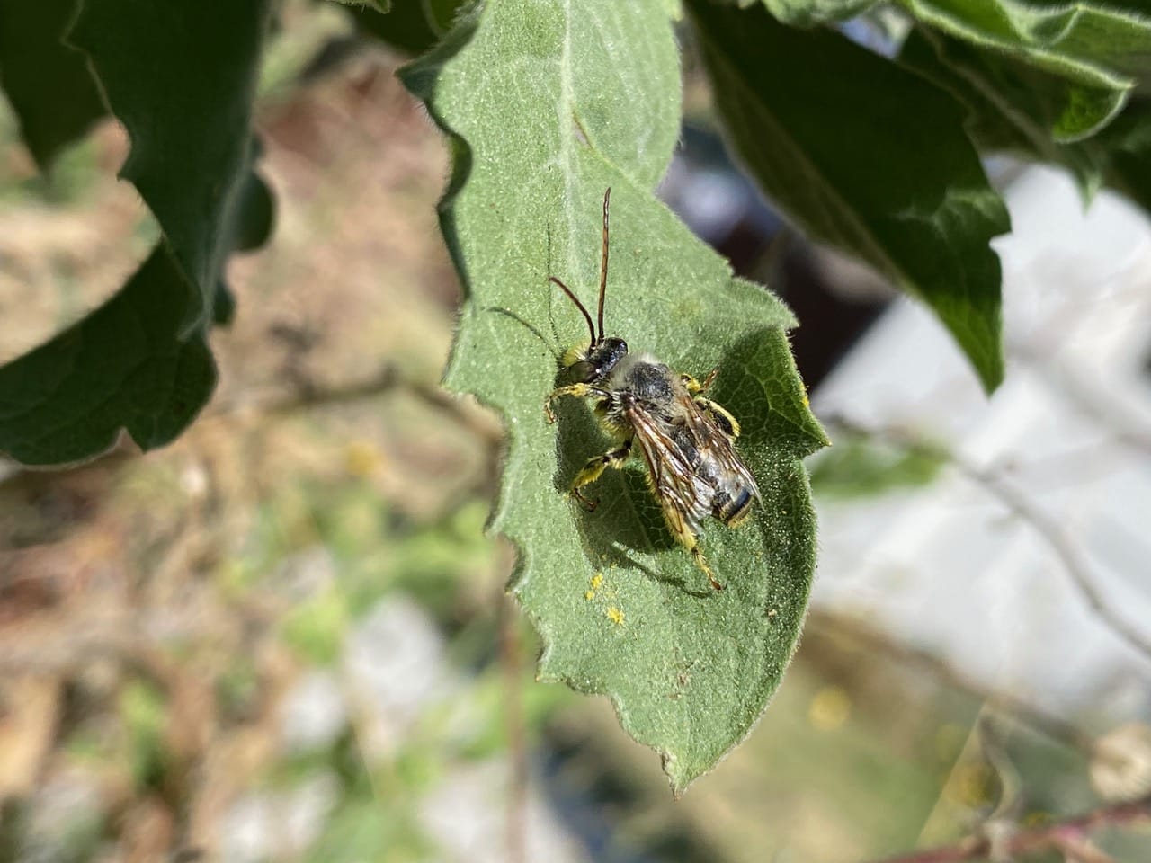 Since it is a warm, sunny morning, all of the male Longhorn Bees have woken up from their regular roost on the Elegant Tarweed. They are already zipping around seeking nectar. There is, however, this lone male resting stock-still on a leaf of the Telegraphweed, Heterotheca grandiflora. Why is he sleeping away from the other boys?