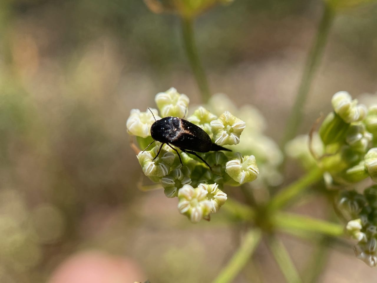 A Tumbling Flower Beetle (family Mordellidae) is feeding on a floral umbel of California Yampah.