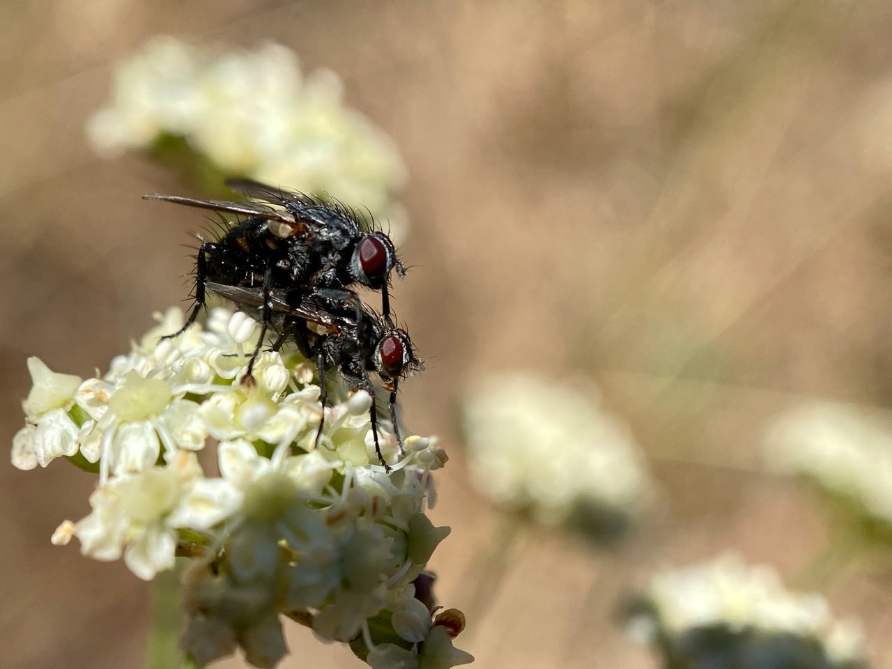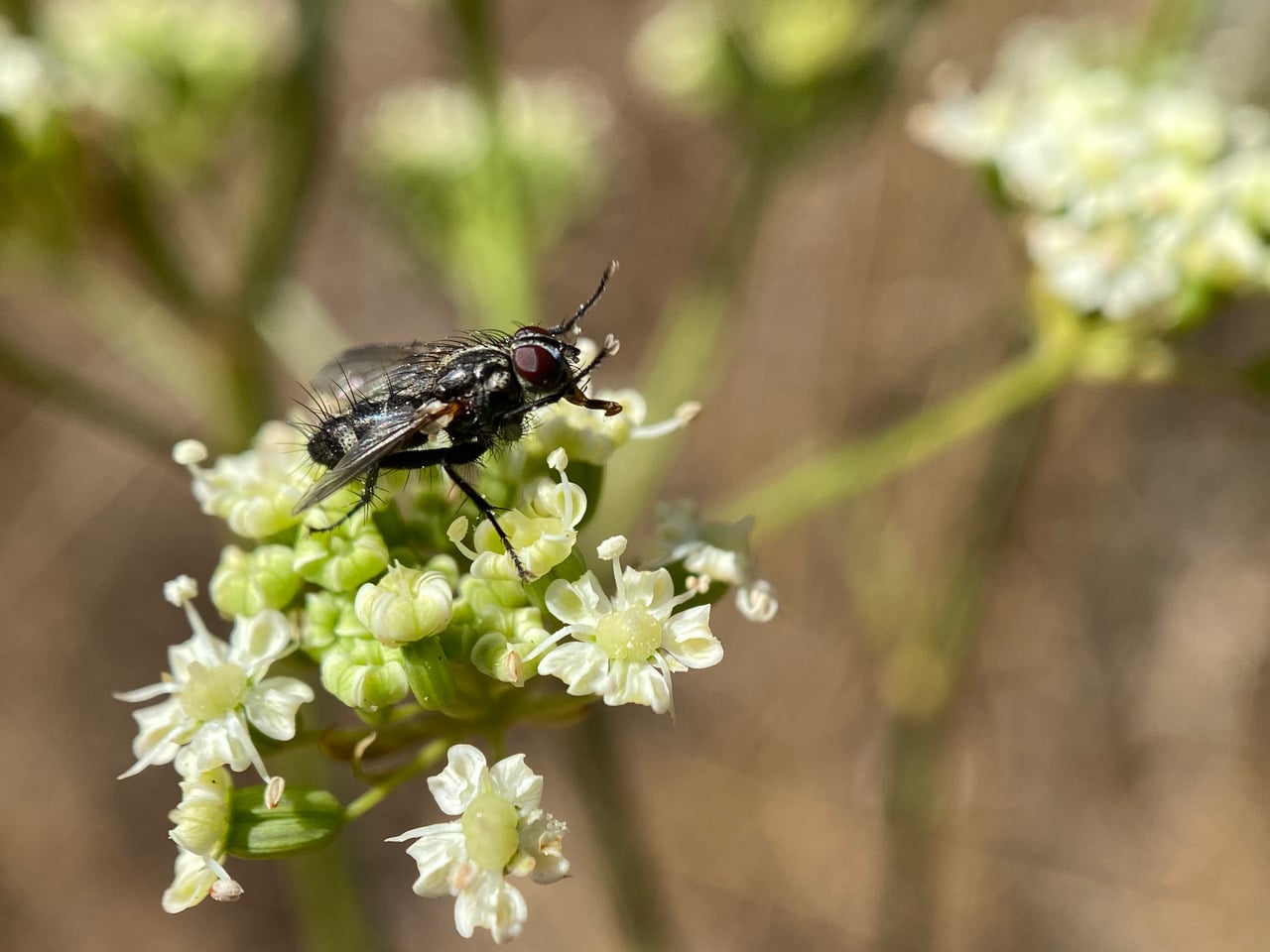 A Common Cluster Fly is foraging on the flowers of California Yampah, Perideridia californica.