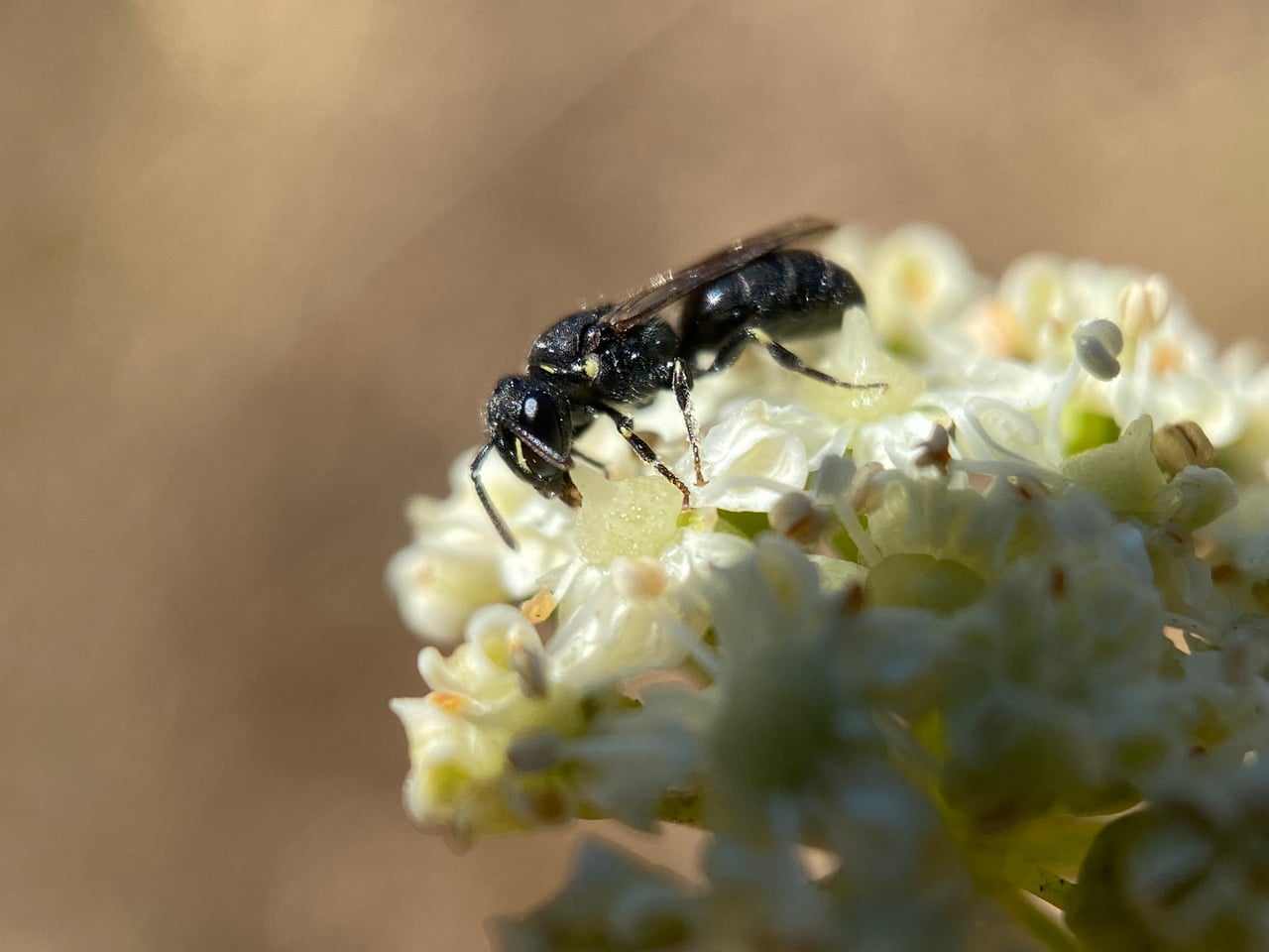 A female Masked Bee, Hylaeus sp. (family Colletidae) is foraging on the Yampah flowers. The small shallow flowers suit her well, as she can access the nectar easily with her short tongue. Although she is a female bee, we don’t see scopae on any part of her body. Hylaeus females transport the nectar and pollen they have gathered in their crops (part of their gut), and regurgitate them back at their nest. Their short tongue serves another vital function – it is used to spread a water-proofing, cellophane-like material on the walls of their nest cells.
