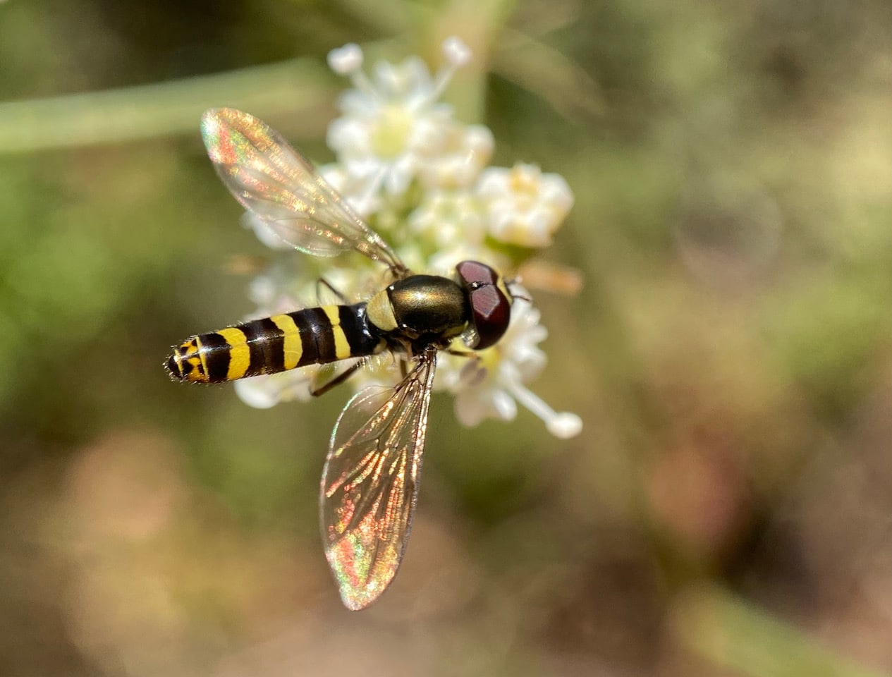 A Diamond Spottail hoverfly, Fazia micrura (family Syrphidae) stops to refuel on a flower umbel of California Yampah. There are four diamond-shaped yellow markings near the tip of the abdomen. It is a male with holoptic eyes that meet along a central line on top of the head.