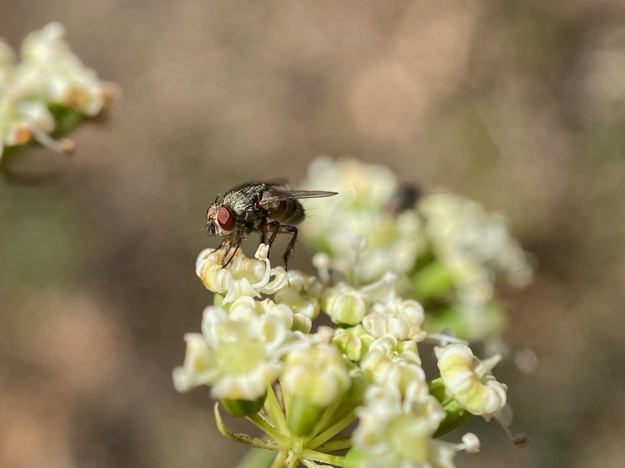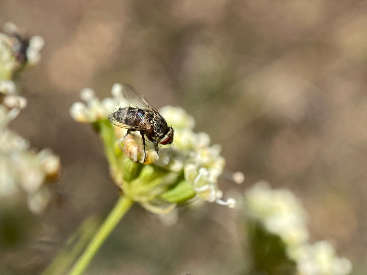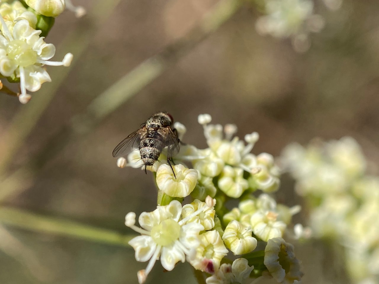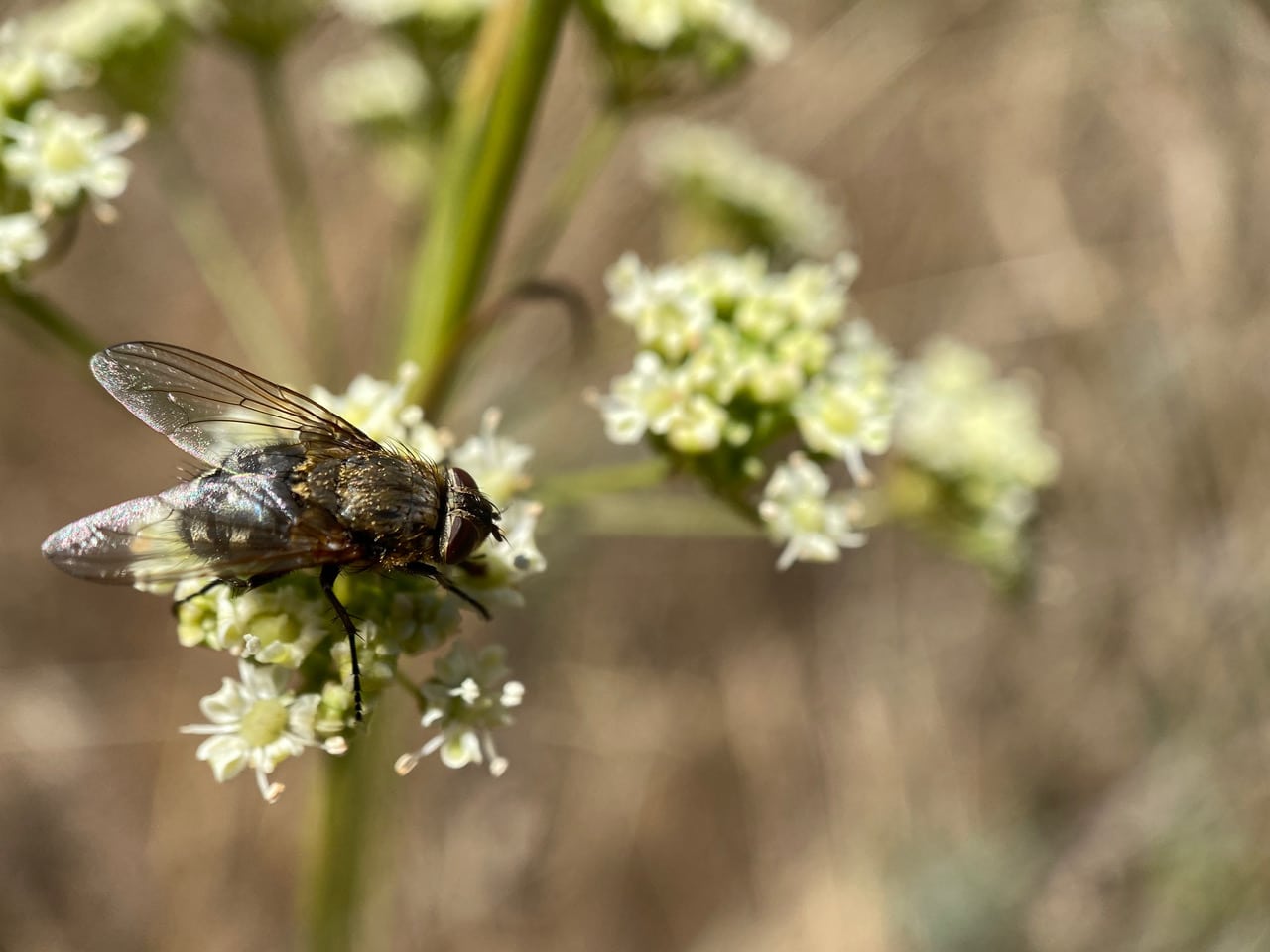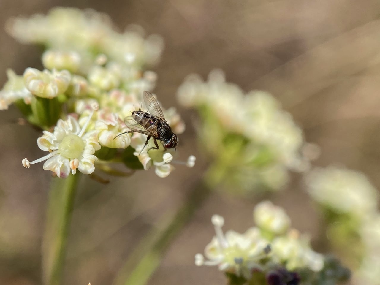 A small fly is flitting between the unbels of Yampah flowers. It is probably a Bristle Fly, Siphona sp. (family Tachinidae).