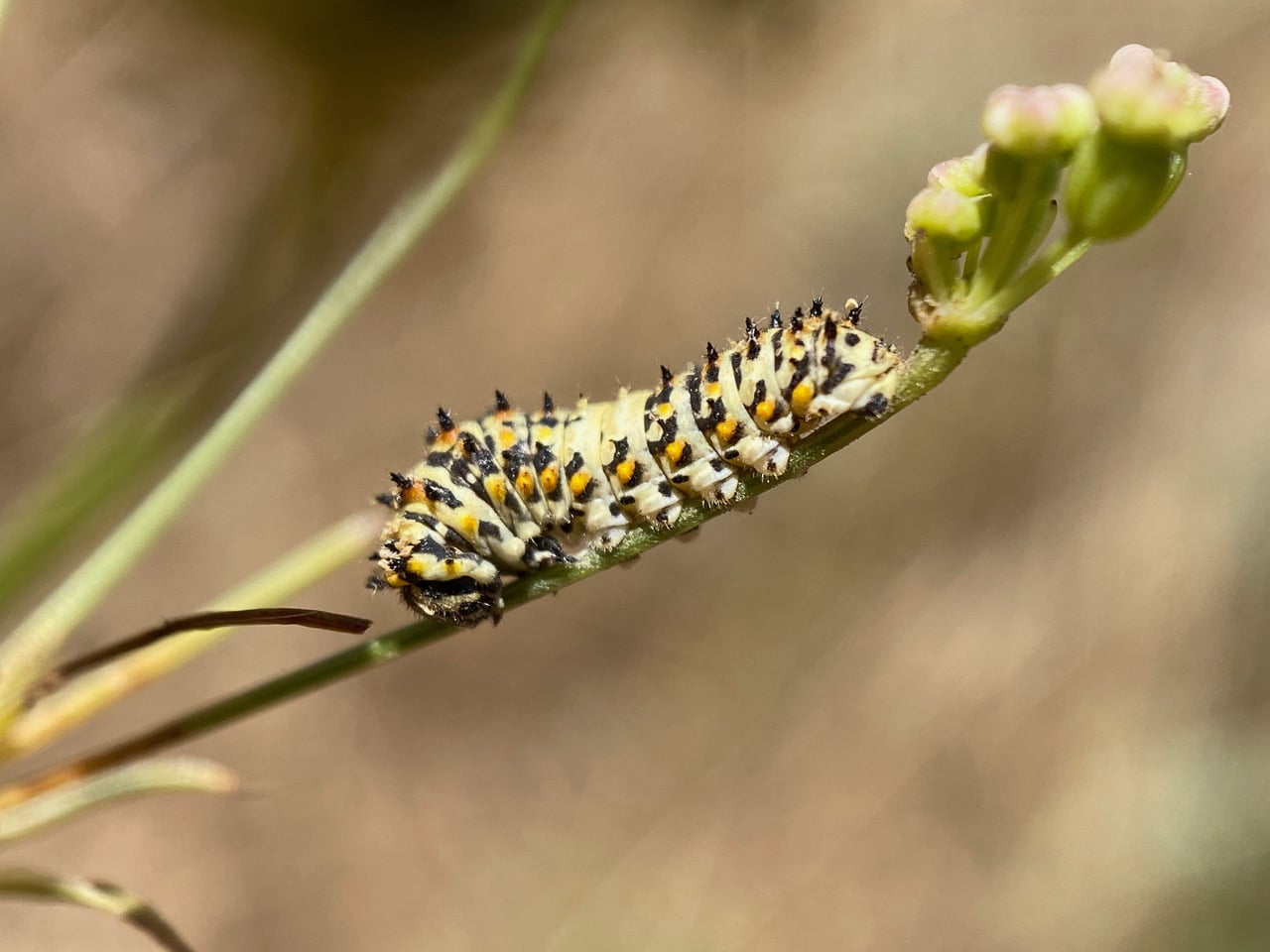 The Anise Swallowtail caterpillar is still on its California Yampah, Perideridia californica. It is draped on an umbel of flower buds, appearing more yellow than ever. I wonder if it has molted?