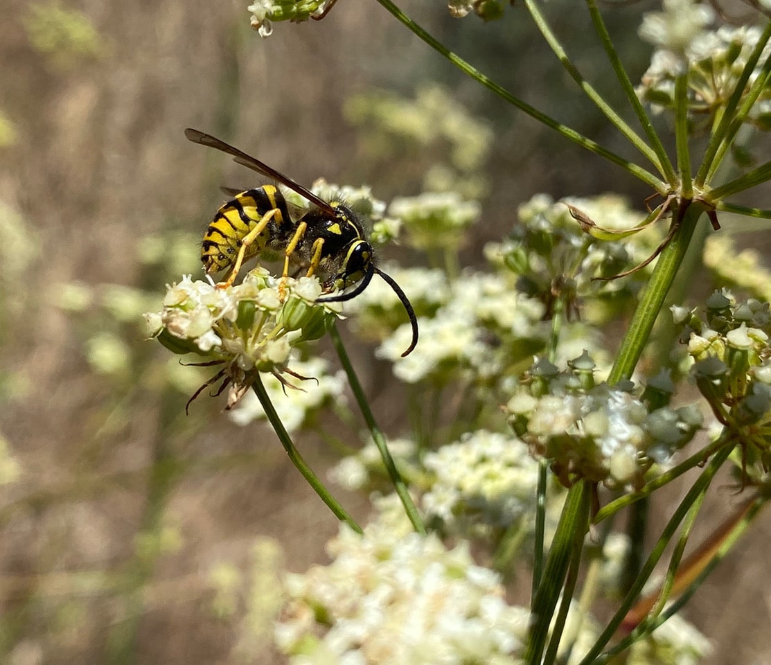 Nearby, a Yellowjacket wasp is foraging on another Yampah. The wasps are notorious caterpillar hunters. Again, I have to remind myself that I can’t worry for the safety of the caterpillar, that I am here as an unbiased observer.