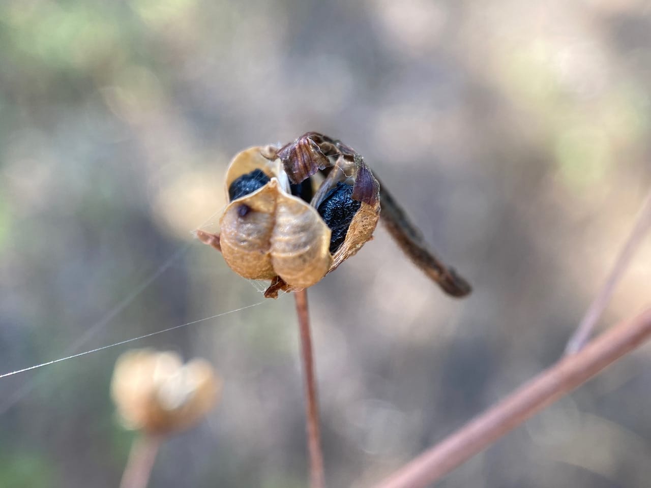 Passing the tall Soap Plant, Chlorogalum pomeridianum, I pause to say hello to the Two-tubercled Orb-weaver Spider. Alas, she’s no longer on her seed capsule, or any other seed capsule today. She must have gone off to lay her eggs, as most female spiders do at the end of their life. I miss her already.