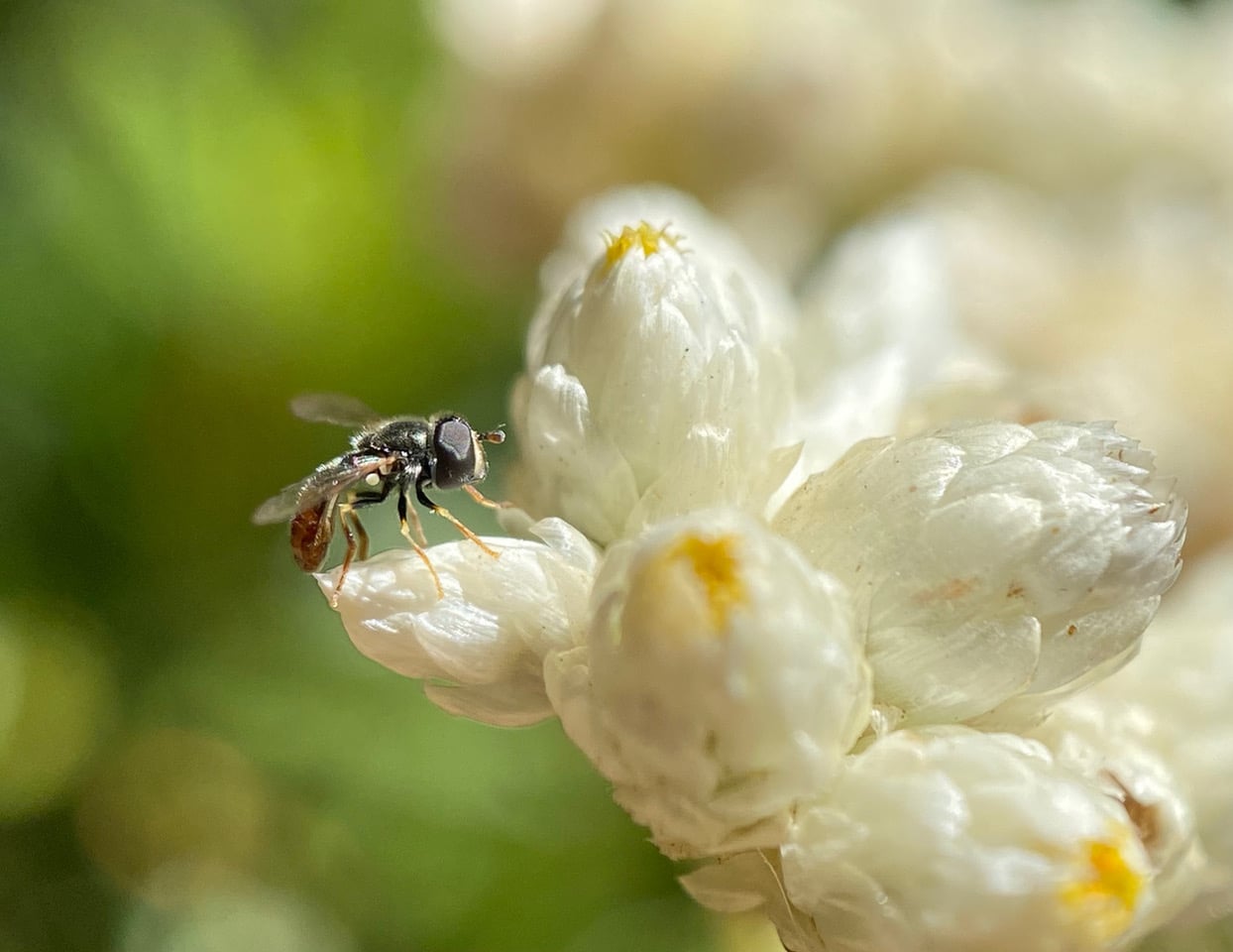 Hunched over an open flowerhead of California Everlasting, Pseudognaphalium californicum, a Black-backed Grass Skimmer, Paragus haemorrhous (family Syrphidae) is feeding on the flowers.