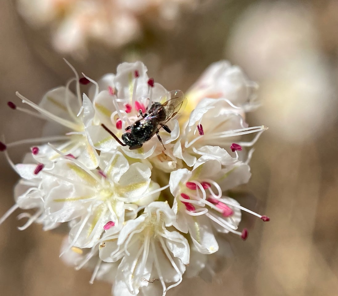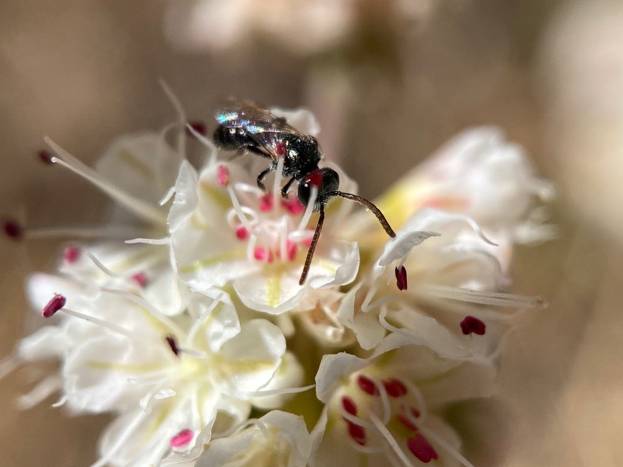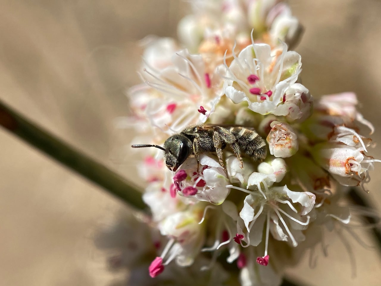 A Sweat Bee, Halictus sp. (family Halictidae) is resting motionless among the flowers of a Nude Buckwheat, Eriogonum nudum. She has not been collecting pollen – her scopae are empty. Not a hair out of place, she looks pristine. Is she freshly emerged? Halictidae exhibit a wide range of life histories and social behaviors. The social species are mostly generalists that enjoy a long season, continuously producing new workers through the seasons.