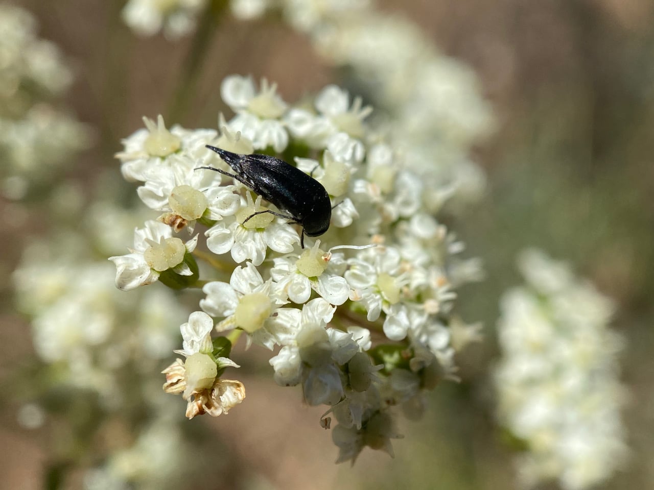 The ubiquitous Tumbling Flower Beetles (family Mordellidae) is commonly found wherever there’s a concentration of pollen. Small, tightly clustered flowers that offer generous pollen are their favorite. Yampah fits the bill. So do Buckwheats, Yarrow, Milkweeds….