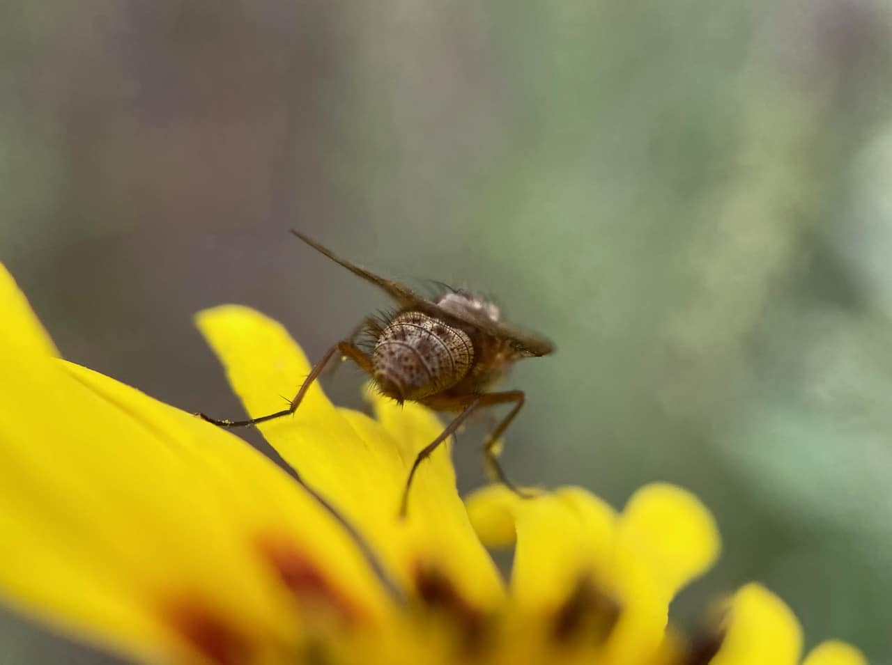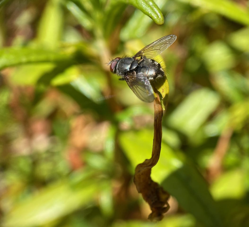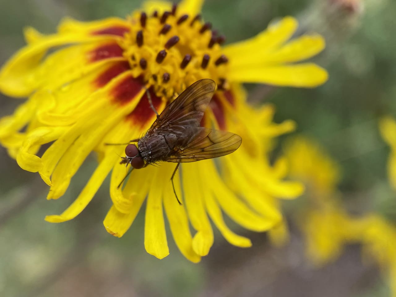 A Cluster Fly (family Polleniidae) lands on a spent flower of Sticky Monkeyflower, its exoskeleton shining like a medieval armor. The large fly is still recognizable by its size and rounded abdomen, even though it has lost all the golden hairs on its thorax.