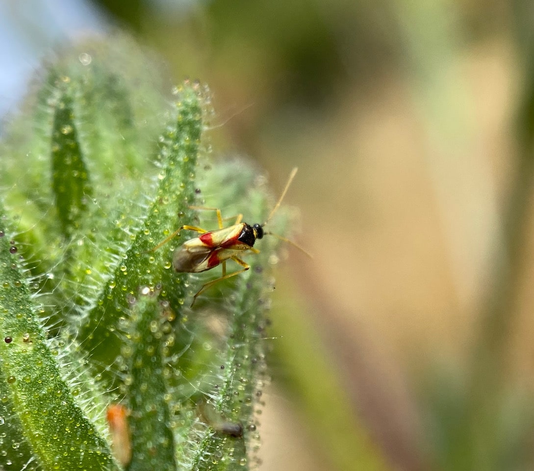 Ooh, here’s a Phacelia Plant Bug, Tupiocoris californicus (family Miridae) walking on the bracts of a flowerhead of Coast Tarweed, Madia sativa. Sometimes I wonder if the common name isn’t a misnomer. I have never seen this bug on Phacelia, but have only found it on the tarweeds. In fact, it is one of the guild of bugs that are specialized for living on sticky plants. It can navigate the glandular hairs with the greatest of ease.