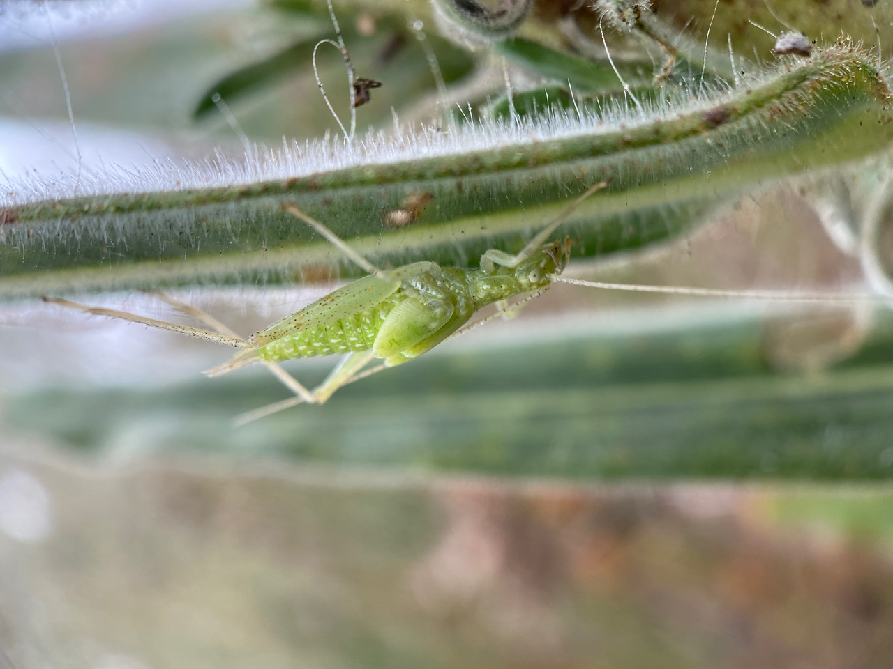 Wait, there’s something light green that stands out among the darker leaves of Elegant Tarweed. It is a nymphal Common Tree Cricket, Oecanthus sp. (family Gryllidae). Note the prominent wing pads of this juvenile.