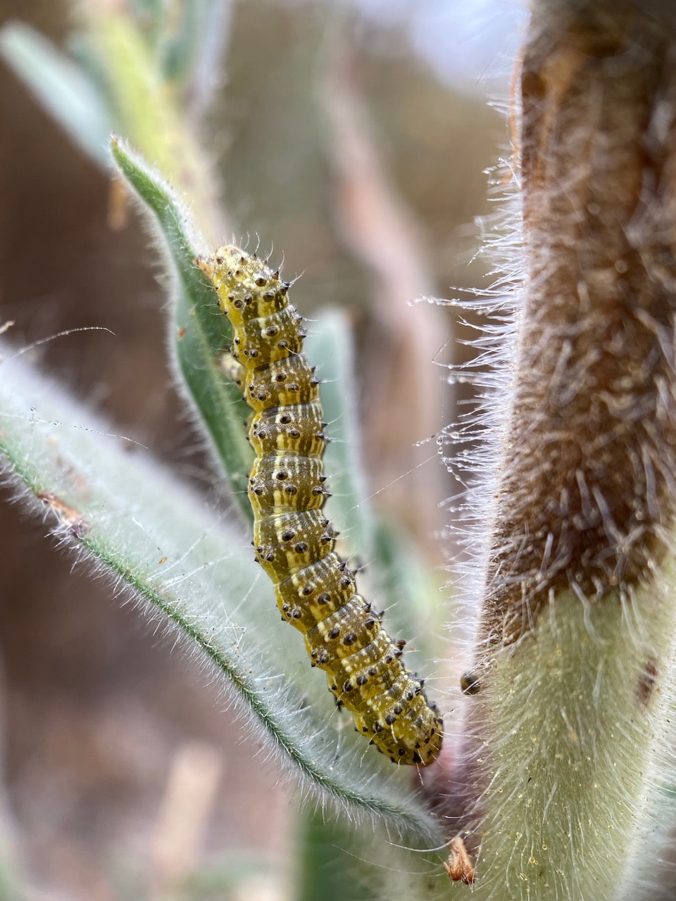 Another sticky venture into the tarweed patch at Siesta Gate. There are still plenty of caterpillars on the tarweed, but much fewer than before. The wasp cocoons prove to be a challenge to find today. Maybe most of the wasps have emerged, and the spent cocoons have dropped off the plants?
