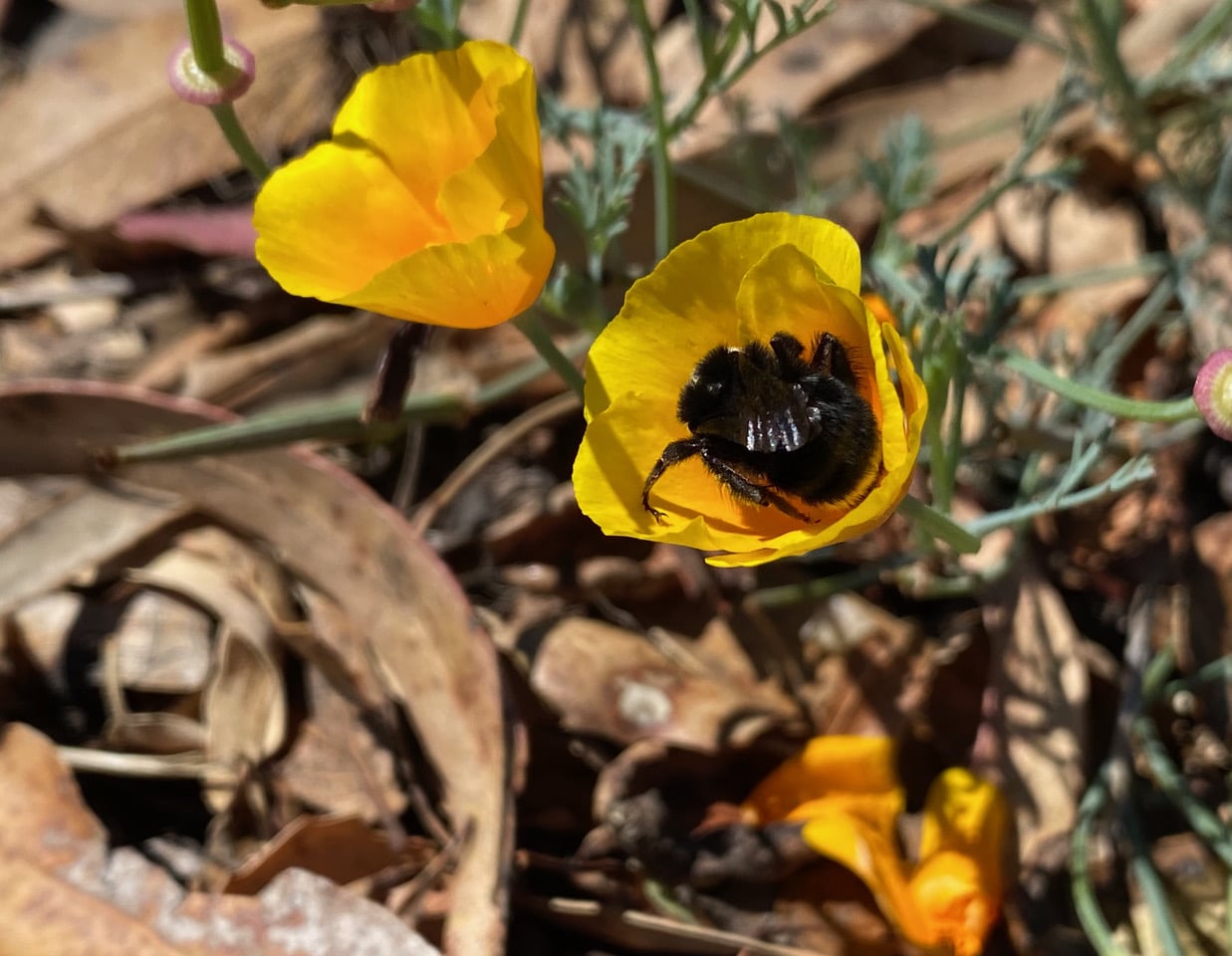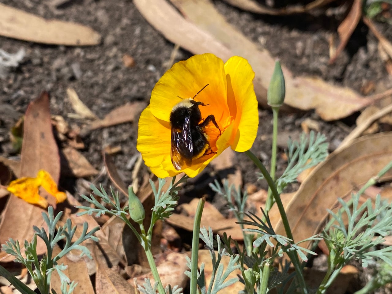 Most of the California Poppies have disappeared with the mowing up here. There are only three plants left standing, and a Yellow-faced Bumble Bee, Bombus vosnesenskii is frantically foraging on the remaining handful of flowers.