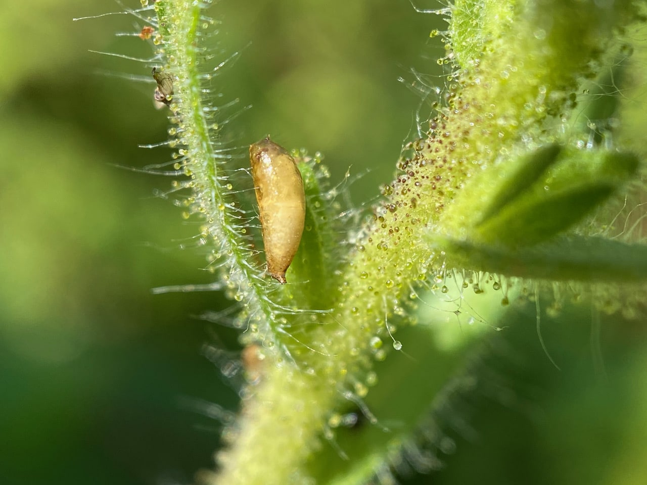 A hover fly pupa (family Syrphidae) at a leaf axil of a Coast Tarweed, Madia sativa. As the pupae turn brown, they are easier to spot on the vegetation than the elusive green larvae. The adult fly will emerge from the broad end of the pupa.