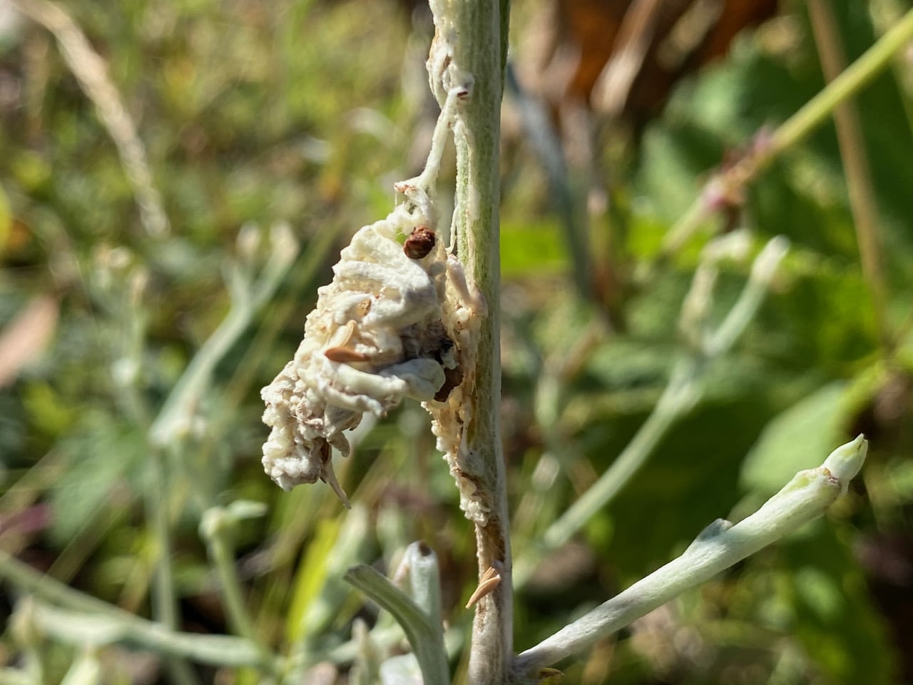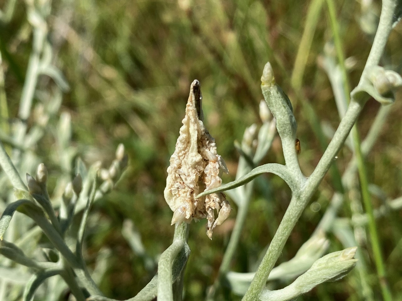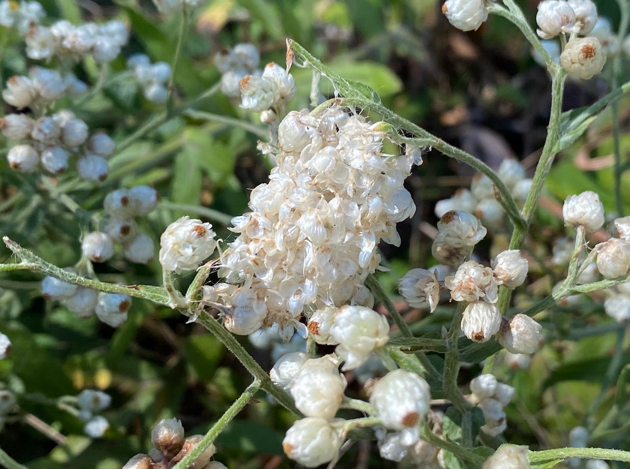 On the hillock is a thriving population of the Fragrant Everlasting, Pseudognaphalium beneolens. The flowers are still in early buds. Here’s an American Lady caterpillar nest in the making! The young caterpillar has webbed together parts of the flower buds to construct a shelter in which it can feed in safety.