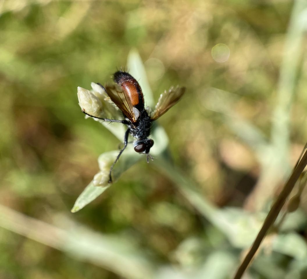 Ooh, that’s an atypical Bristle Fly not previously recorded for Skyline Gardens! Cylindromyia intermedia (family Tachinidae) has an elongate, cylindrical black abdomen with red on the sides. Unlike most Bristle Flies, Cylindromyia is not particularly bristly. The genus is found worldwide; more diverse in western North America. Cylindromyia mimics wasps in color, shape and posture. The fly tends to hold its abdomen tipped up. Adults are common flower visitors in open weedy areas in the summer. The larvae are parasitoids of Stink Bugs.