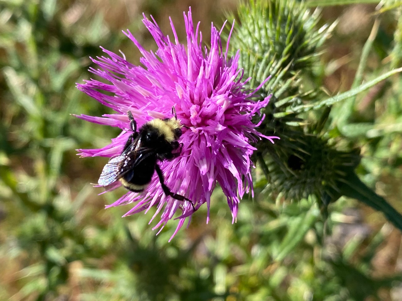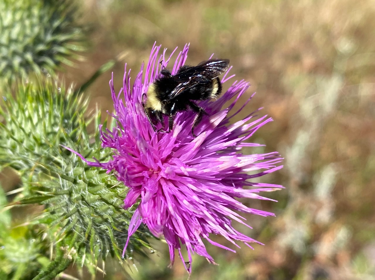 I am no big fan of the exotic thistle, but at such dire times I appreciate its value to the local wildlife. This Yellow-faced Bumble Bee, Bombus vosnesenskii is not discriminating against the non-native – it is just glad to have a good sip of nectar!