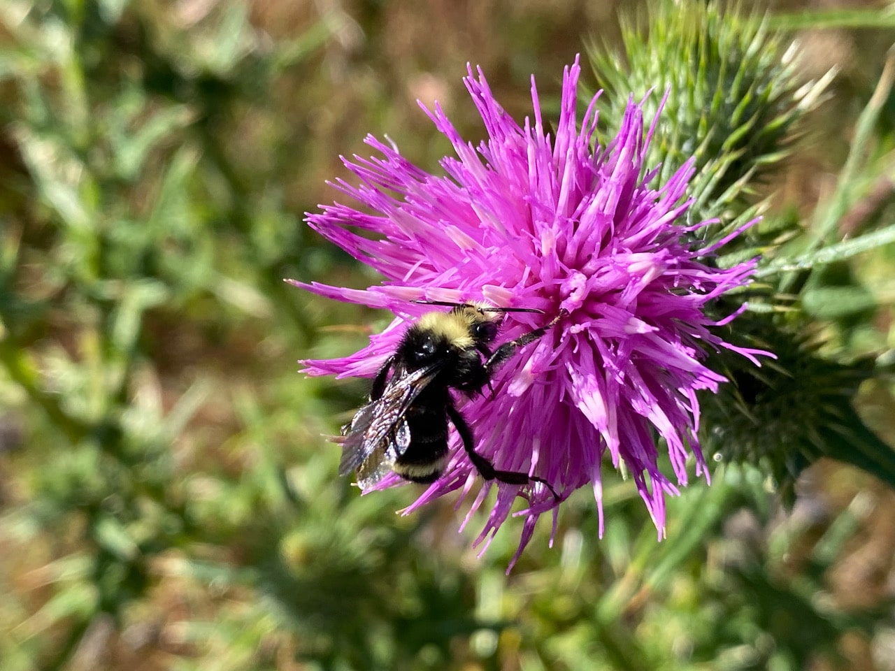 The Bull Thistle, Cirsium vulgare is native throughout most of Europe, western Asia and northwestern Africa. It is naturalized in North America and other parts of the world. It is a tall biennial or short-lived monocarpic thistle, often a ruder species, colonizing bare disturbed ground. The flowers are a rich nectar source used by numerous pollinating insects, including bees and butterflies. The plant serves as a host plant for the Painted Lady butterfly. The seeds are eaten by goldfinches. The downy plumes of the seed pods are used by birds for nesting material. The support for pollinators and pest-eating birds could outweigh its drawbacks.