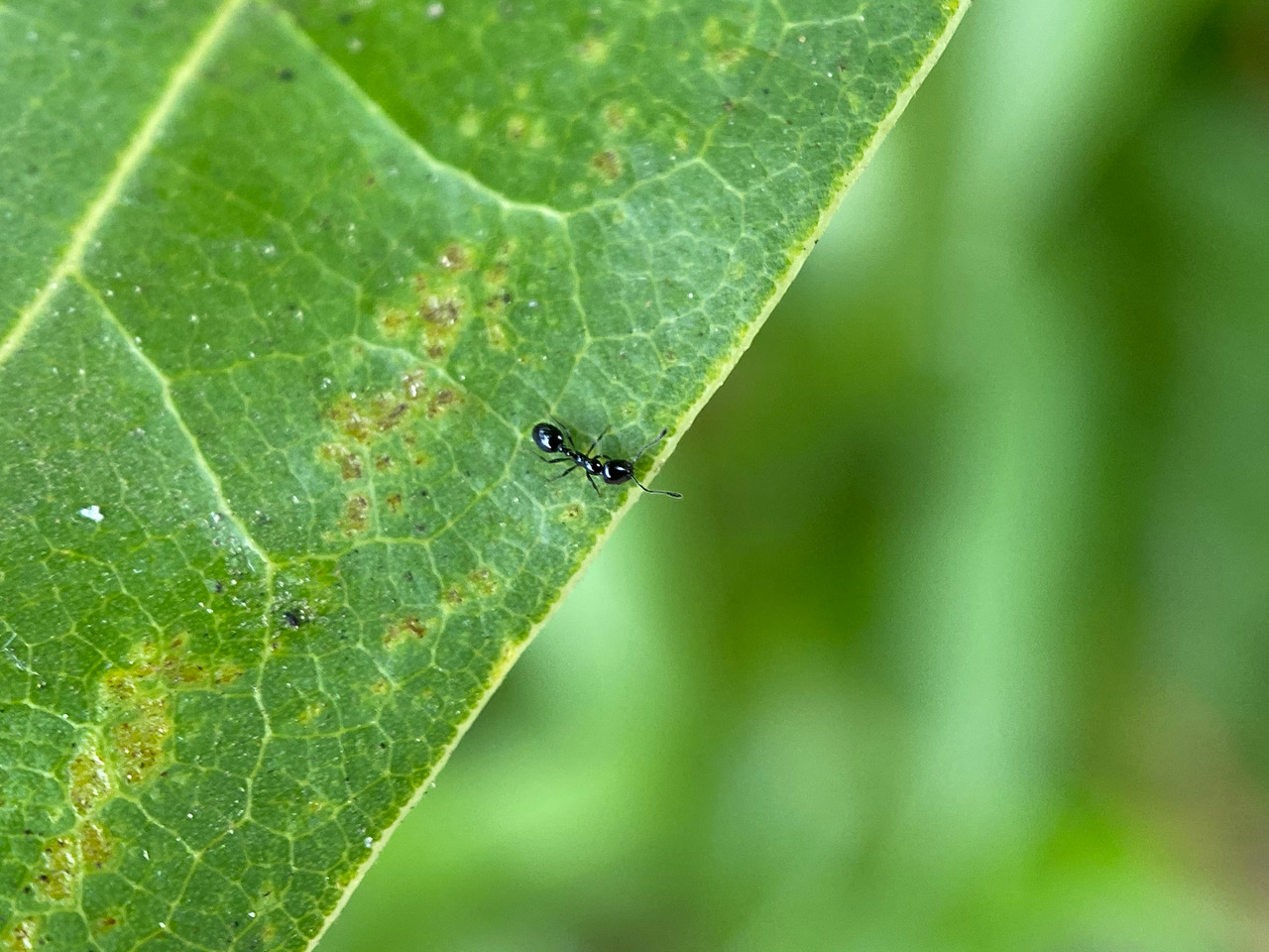 To complete the menagerie of miniatures found on the California Bay leaf today, here’s one of our smallest native ants, the Ergatogyne Trailing Ant, Monomorium ergatogyna (family Formicidae).