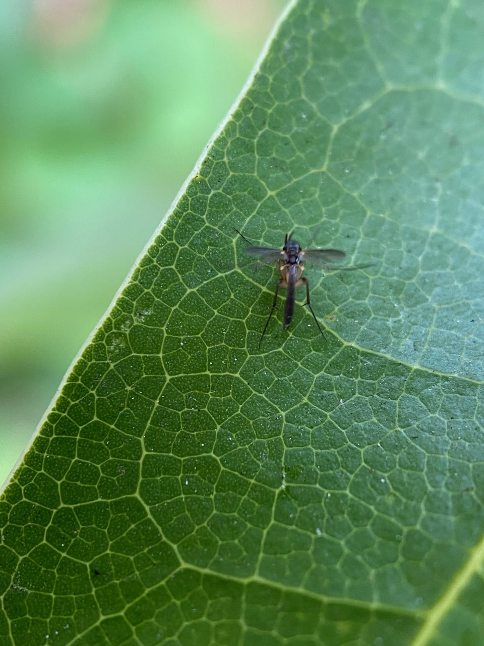 A tiny midge is running swiftly on the surface of a California Bay leaf. Of the dozen pictures I took, only this one has parts of the insect in focus. It appears to be a Fungus Gnat, family Mycetophilidae.