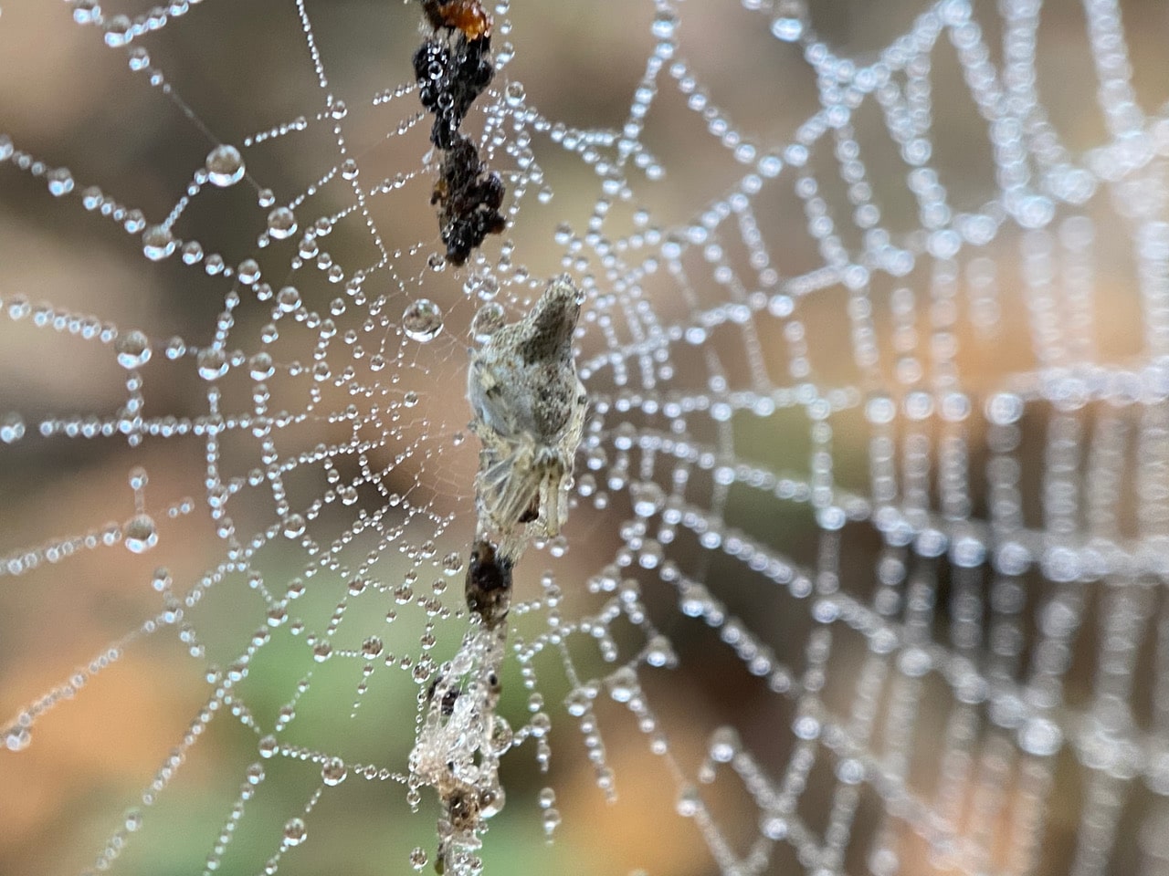 In the shade, droplets of fog festoon the orb web of a Conical Trashline Orbweaver, Cyclosa conica (family Araneidae).