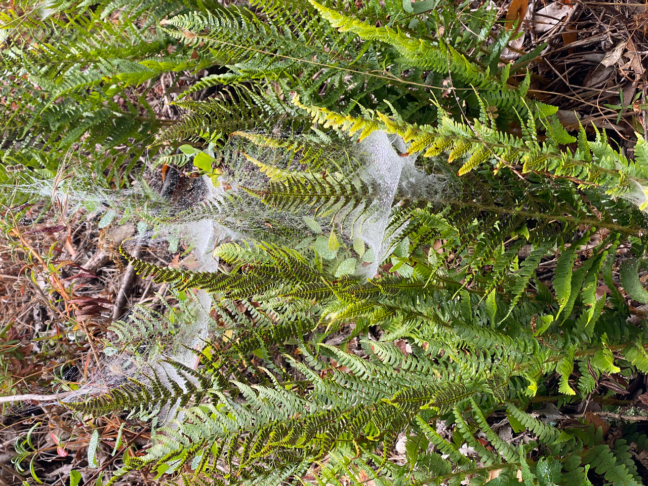 The Wood Ferns on the steep slopes along Skyline Trail provide great support for the three-dimensional webs of the Sheetweb Weavers (family Linyphiidae).