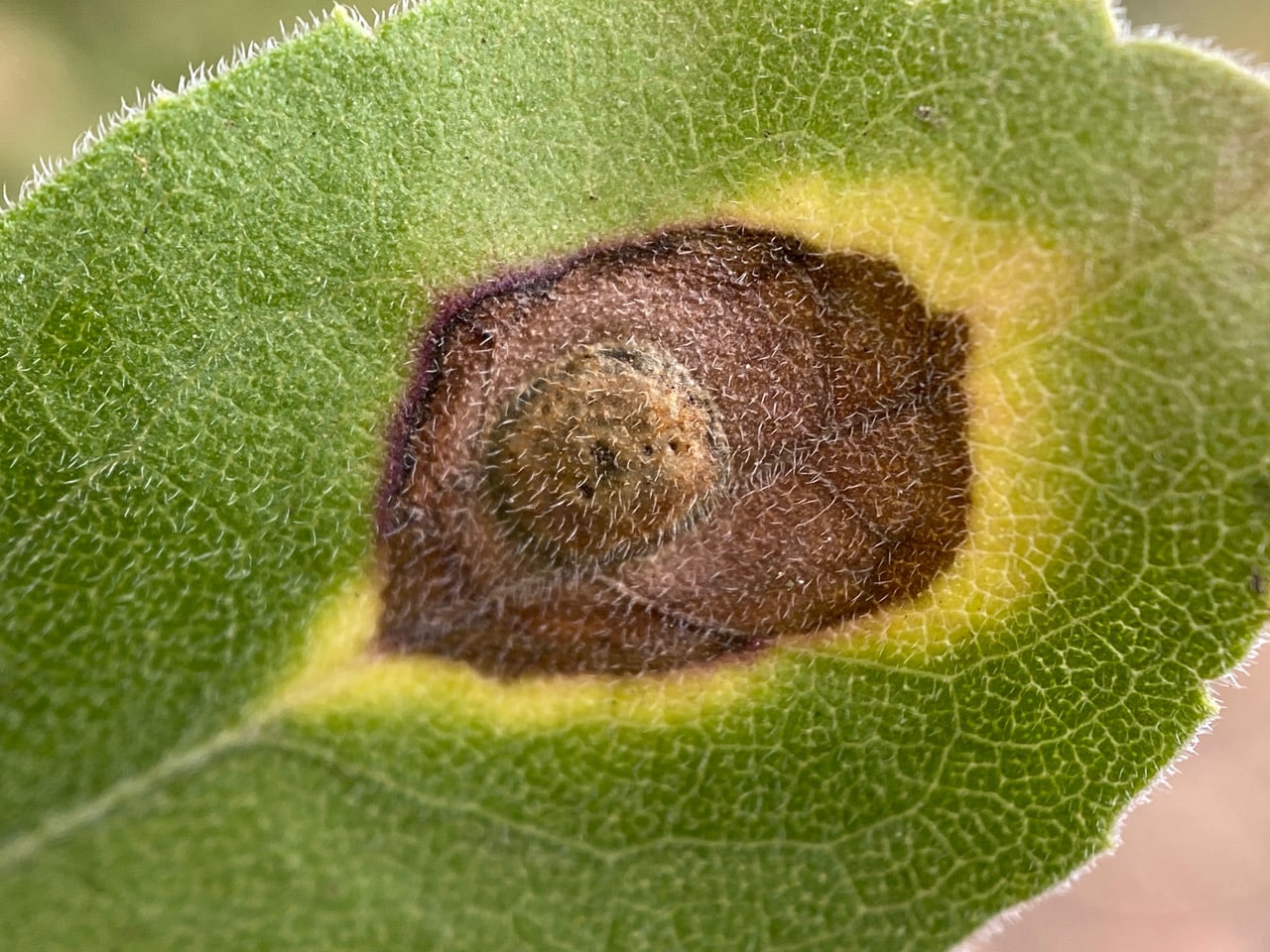 The blisters are actually a well-known goldenrod gall, induced by the gall midge Asteromyia carbonifera (family Cecidomyiidae). The midge induces flat, circular galls in the leaves of various goldenrods (Solidago). One to ten or more larvae develop in each gall. Color and size of the gall vary by host species and number of larvae. The galls contain a symbiotic fungus, Botryosphaeria dothidea, which the larva apparently does not eat. The fungus seems to confer some protection against parasitoid wasps. Females carry spores of the fungus.