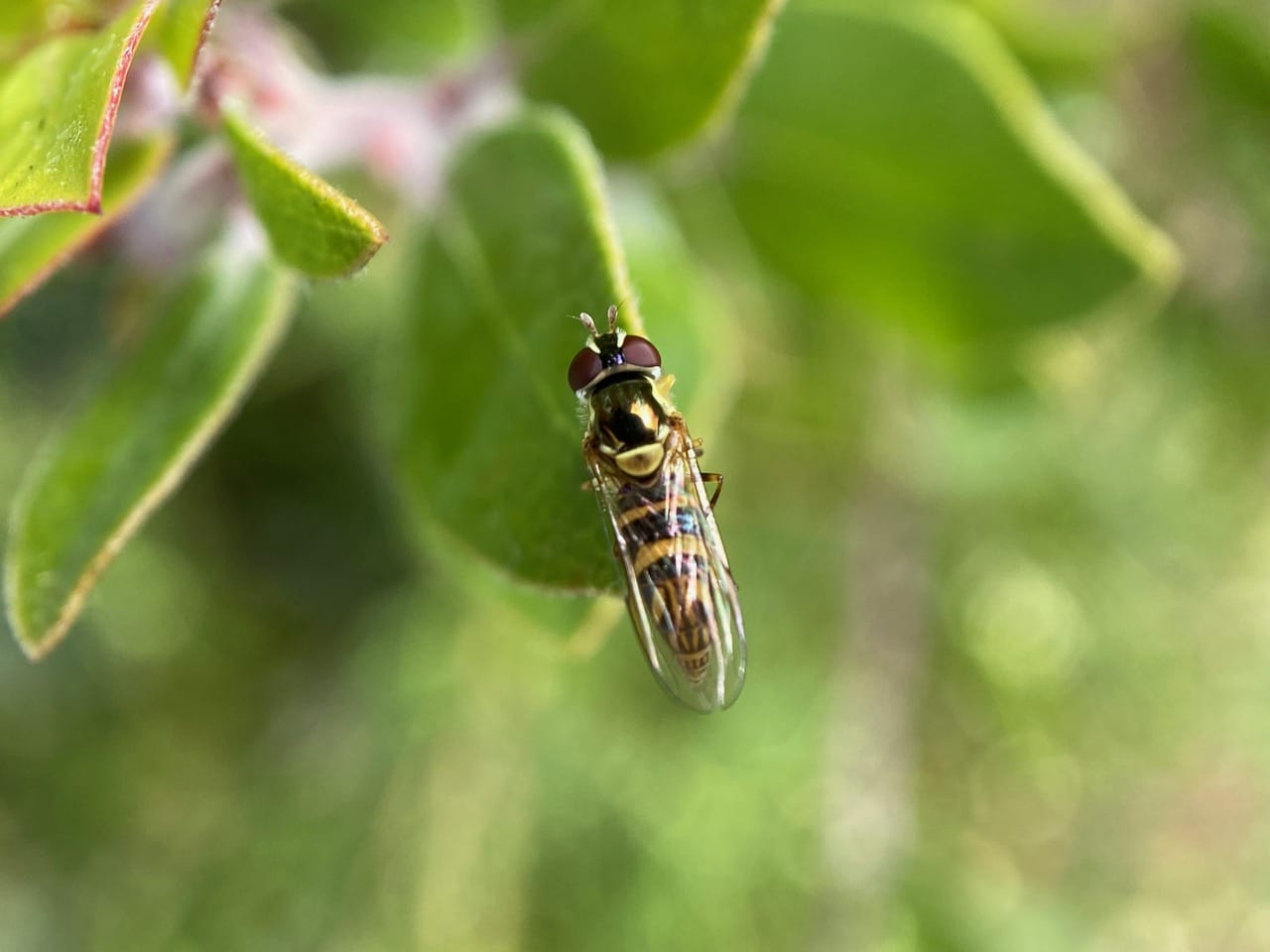 A hover fly is perched with its wings closed on a Manzanita leaf. Although its wings are closed, they are transparent enough to show the abdominal patterns below. The fly is a female Oblique Streaktail, Allograpta obliqua (family Syrphidae).