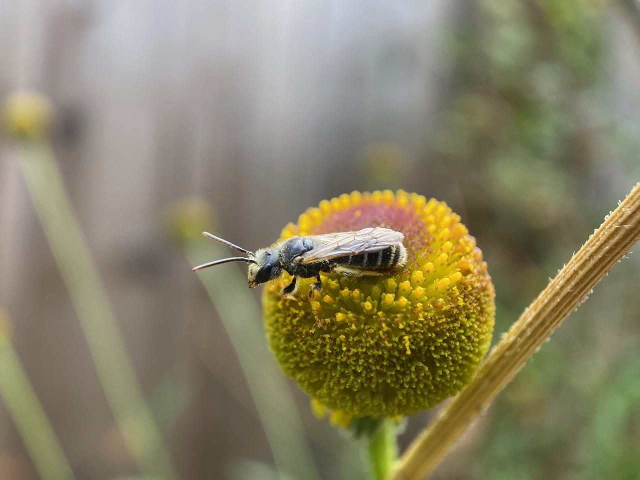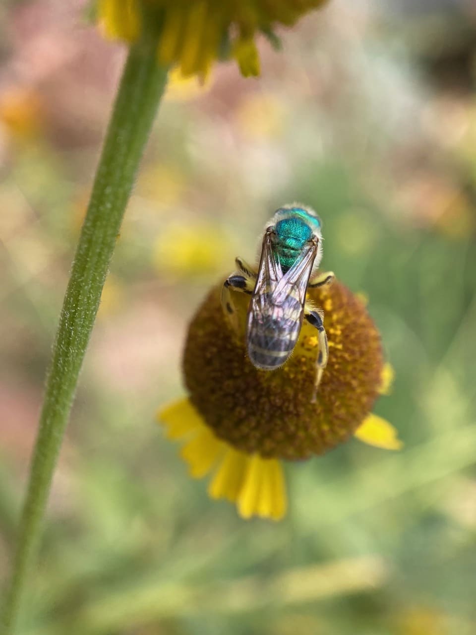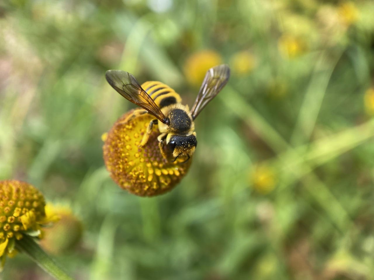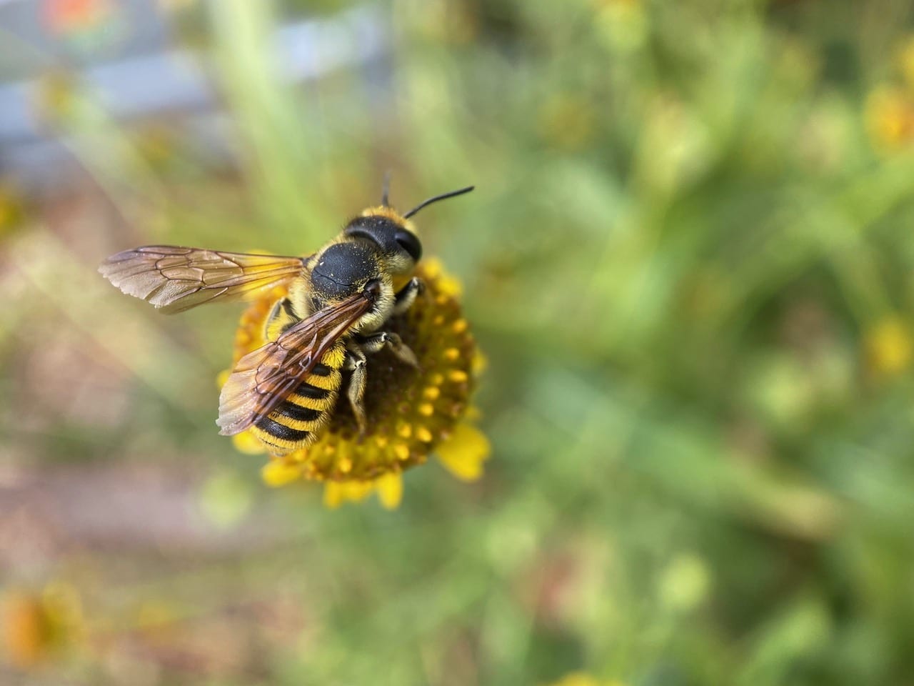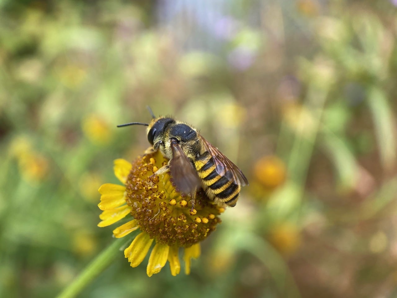 A male Fine Striped Sweat Bee, Agapostemon subtilior (family Halictidae) is foraging on a Sneezeweed flowerhead. Unlike the females of the species which are entirely green, the male has a yellow-and-black striped abdomen.