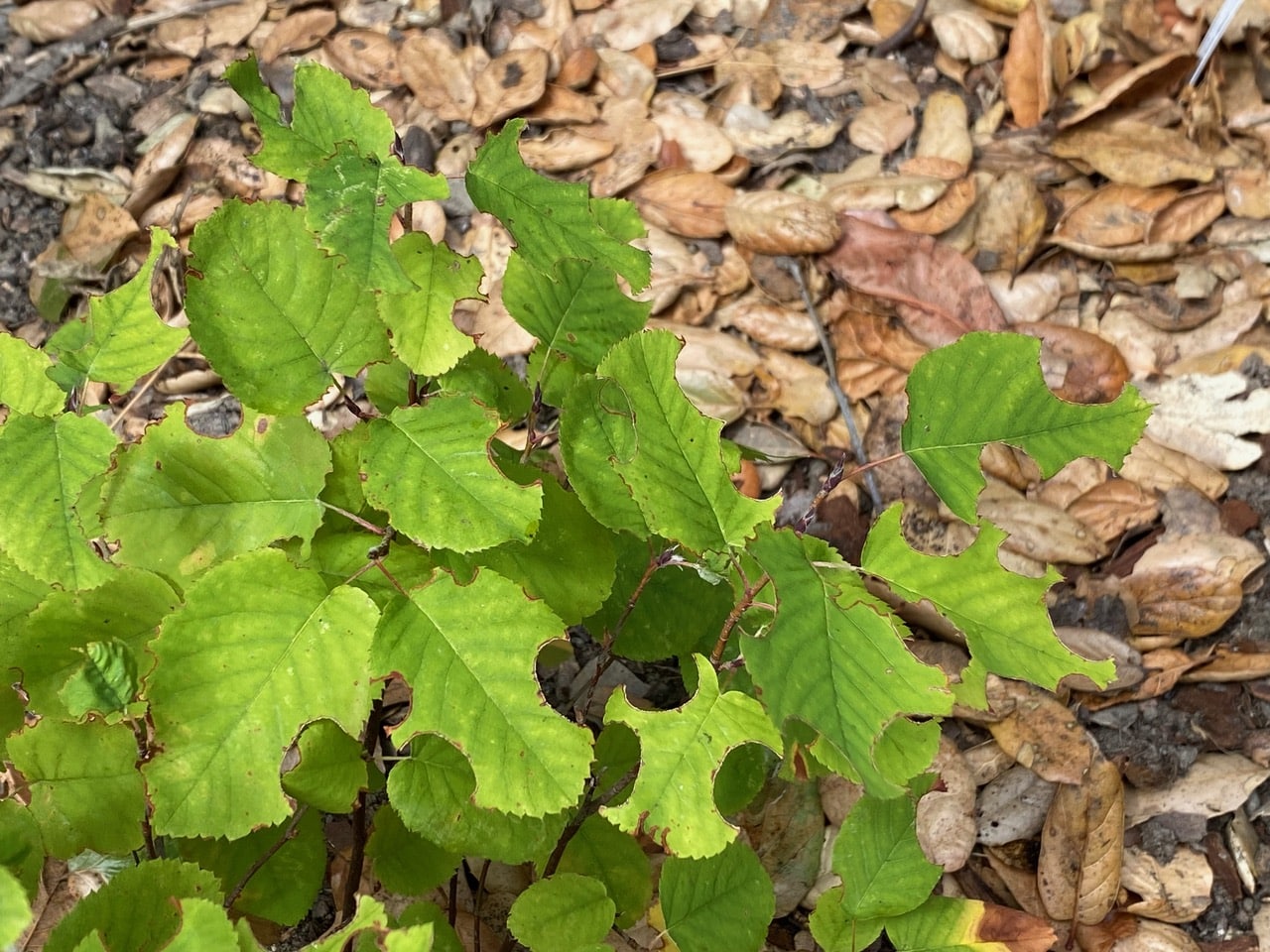 The leaves of this Serviceberry, Amelanchier sp. (family Rosaceae) have been extensively cut by Leafcutter Bees! Leafcutter females are known to favor the leaves of plants in the rose family for lining their brood cells.