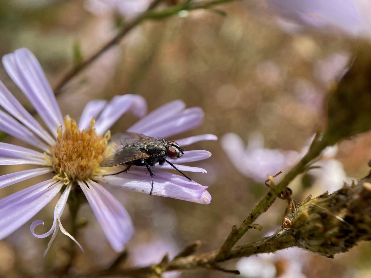 A small, dark, bristly fly is perched on a flowerhead of Pacific Aster, Symphyotrichum chilense. It appears to be a Woodlouse Fly, Stevenia deceptoria (family Rhinophoridae).