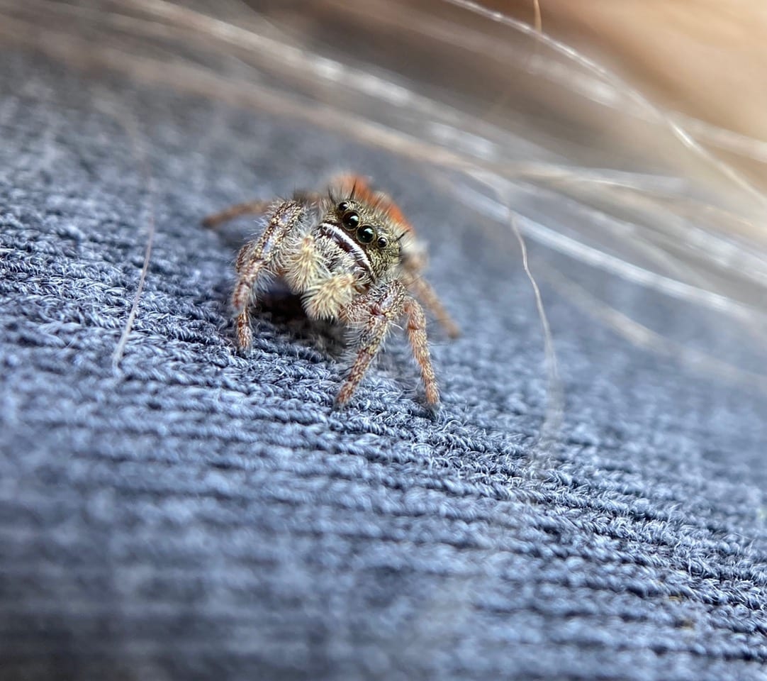 Jumping spiders have excellent vision, with among the highest acuities in invertebrates. The 8 eyes are grouped four on the face (the two big Anterior Median Eyes in the middle, and two smaller Anterior Lateral eyes to the side), and four on top of the carapace. The anterior median eyes provide high acuity but small field of view, while the other six eyes act like our peripheral vision, with lower resolution but broad field of view. Since all eight eyes are fixed in place and can’t pivot independently from the body like human eyes can, jumping spiders must turn to face whatever they want to see well. This includes moving their cephalothorax up and down, an endearing behavior.