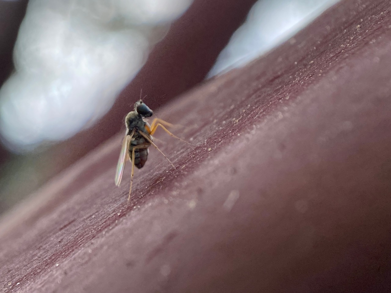 A small fly sidles to the other side of the Manzanita trunk as I approach with the camera. From its upright stance, long legs and large mouthparts, I recognize it instantly as a Woodpecker Fly, Medetera sp. (family Dolichopodidae).