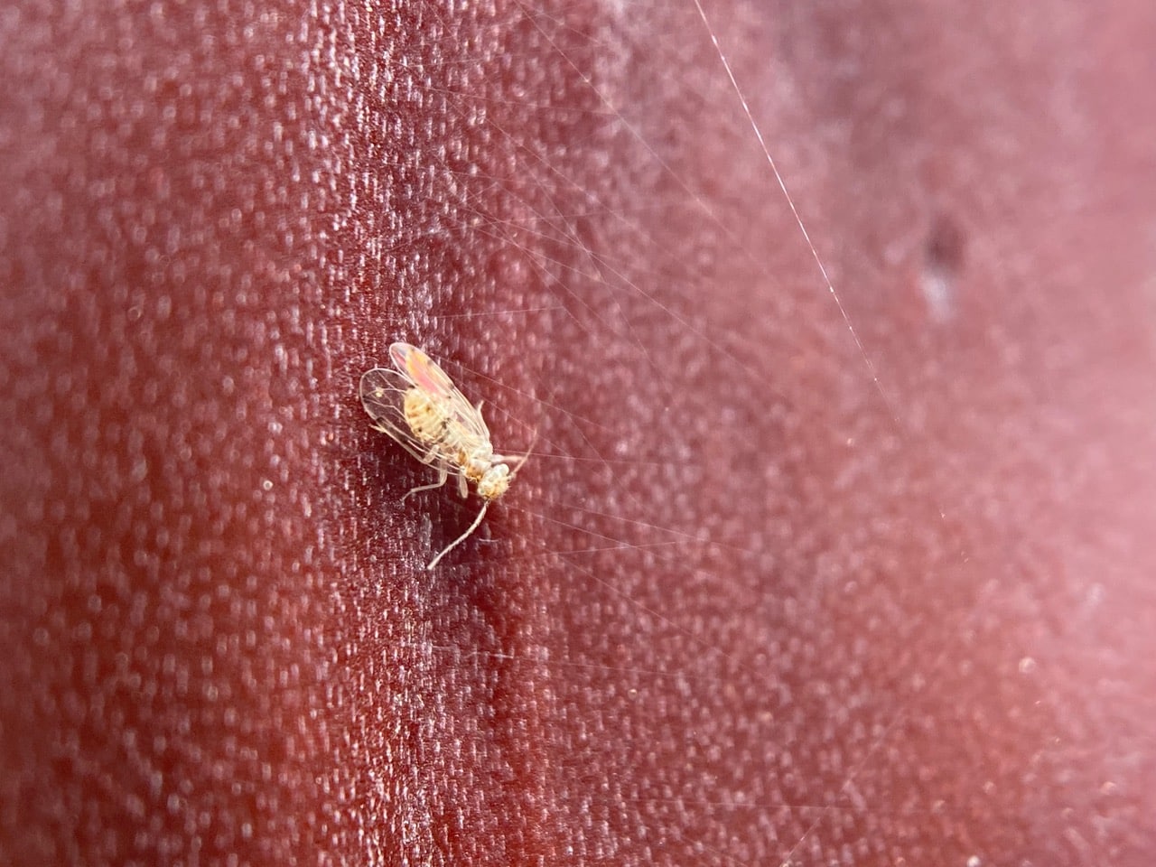 Ectopsocus californicus is a species of Outer Bark Louse found in Australia, Central America, and North America. Ectopsocidae is a family of insects in the order Psocodea (book lice or bark lice). Found worldwide, the family includes fewer than 200 species, most of them in the genus Ectopsocus. The Ectopsocids are tiny (2 mm long) insects with a bulbous head that is wider than the pronotum and both fore- and hindwing with distinct dashes along the margins. Forewings are short, broad, and held in horizontal position. Barklice are found on living or dead foliage of a wide variety of trees, including both deciduous trees and conifers. They are harmless grazers of algae, mold, lichens, and decaying organic material, effectively cleaning the tree. For this reason, they are considered a beneficial insect. Members of genus Ectopsocus are only found on trees. Eggs are laid in webbed groups on leaf surfaces. Due to their presence in the feathers of birds it has been speculated that many species of Ectopsocids disperse by phoresy, hitchhiking rides on migrant birds. Many species of barklice use silk strands to form protective, communal webs on tree trunks. These webs are harmless to the tree and serve multiple purposes for the bark louse colony. The silk webbing shields the soft-bodied bark lice and their eggs from natural enemies such as birds and predatory insects. The webs also protect bark lice from wind and rain. The silken sheets create a protective, defined space for the nymphs and adults to move around the tree trunk as they forage for food.