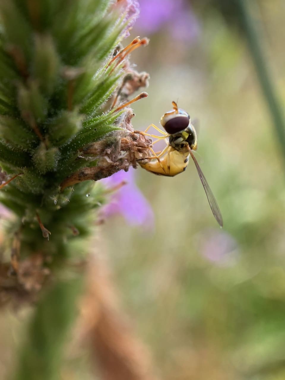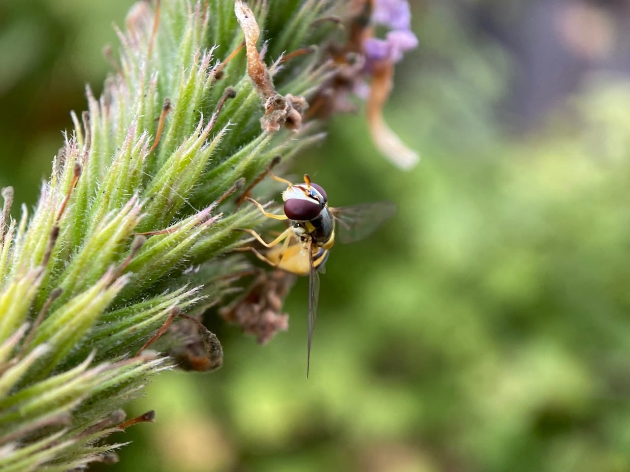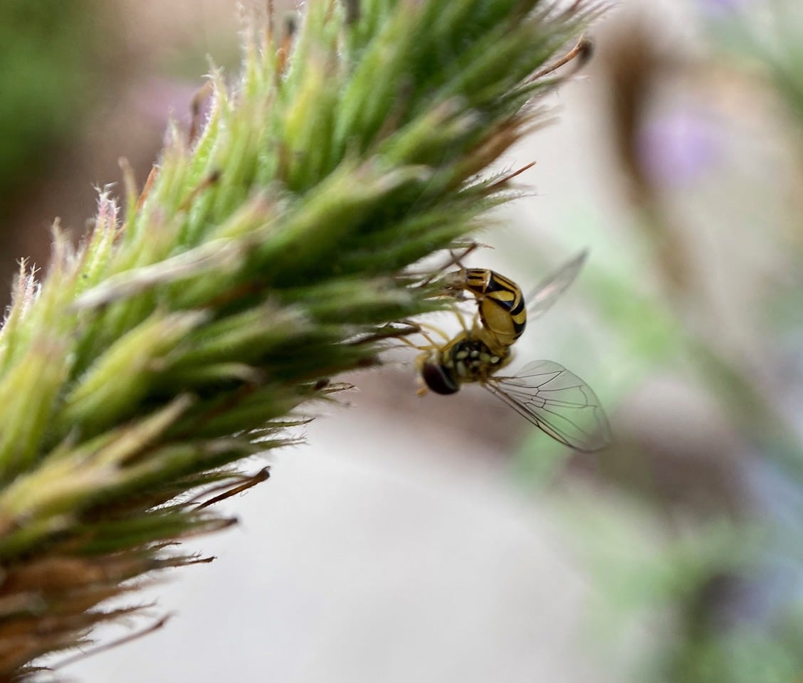 A small hover fly is hovering over the flower spikes of the De La Mina Verbena, Verbena lilacina. Instead of landing on the flowers, it makes extended stops on the spent flowers below. It is obviously not seeking nectar or pollen. A female laying eggs? Closing in with the macro lens, I find a female Oblique Streaktail, Allograpta obliqua (family Syrphidae) with her pointed abdomen curled forward in the process of depositing an egg among the spent flowers.