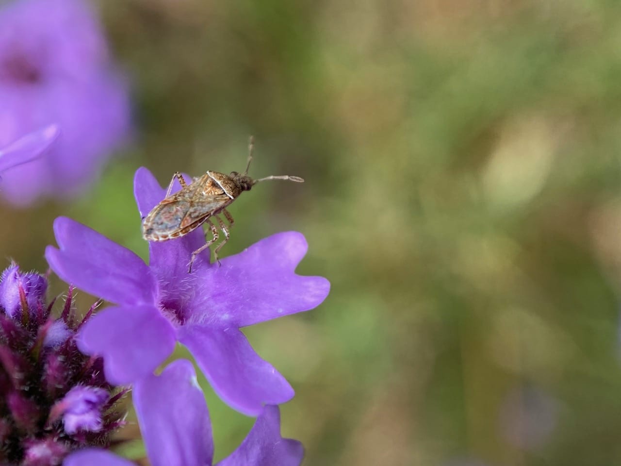 A Scentless Plant Bug, Arhyssus sp. (family Rhopalidae) is lurking among the small lavender flowers of De La Mina Verbena, Verbena lilacina.