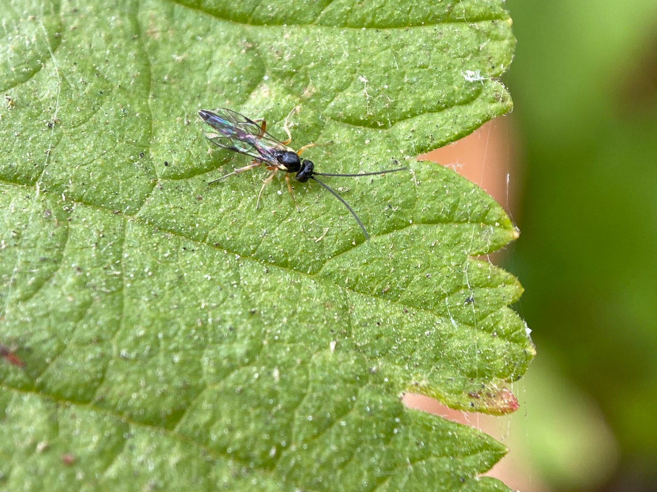 A tiny wasp with long antennae has landed on a leaf of Ocean Spray. From its size I surmise that it is a parasitoid wasp. iNaturalist has helped identify it as an Ichneumonid Wasp, Dusona sp. (family Ichneumonidae).