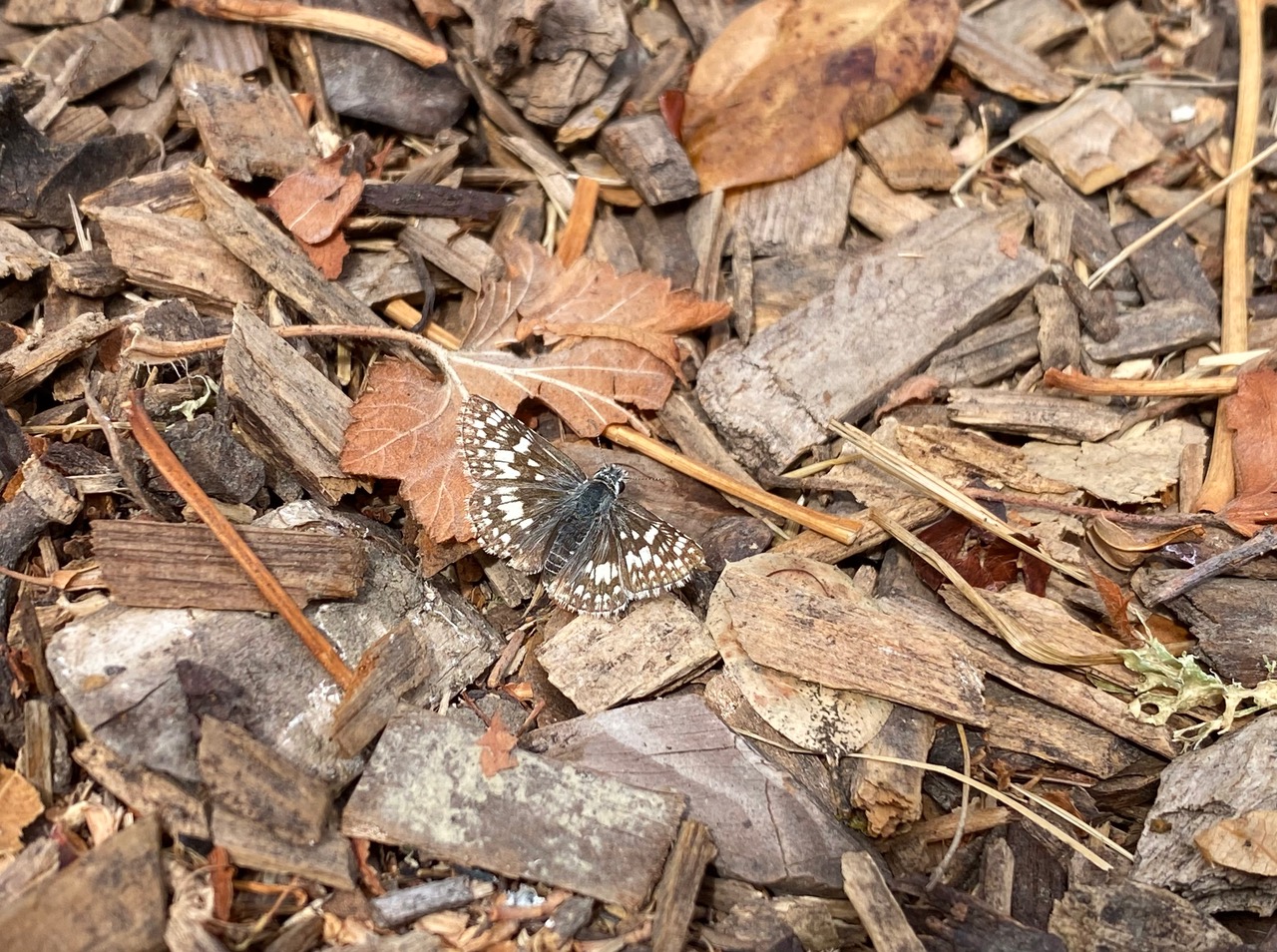 A couple of hours later when I pass the same plant, the Common Checkered Skipper lifts off from the plant and lands on the mulch on the path.