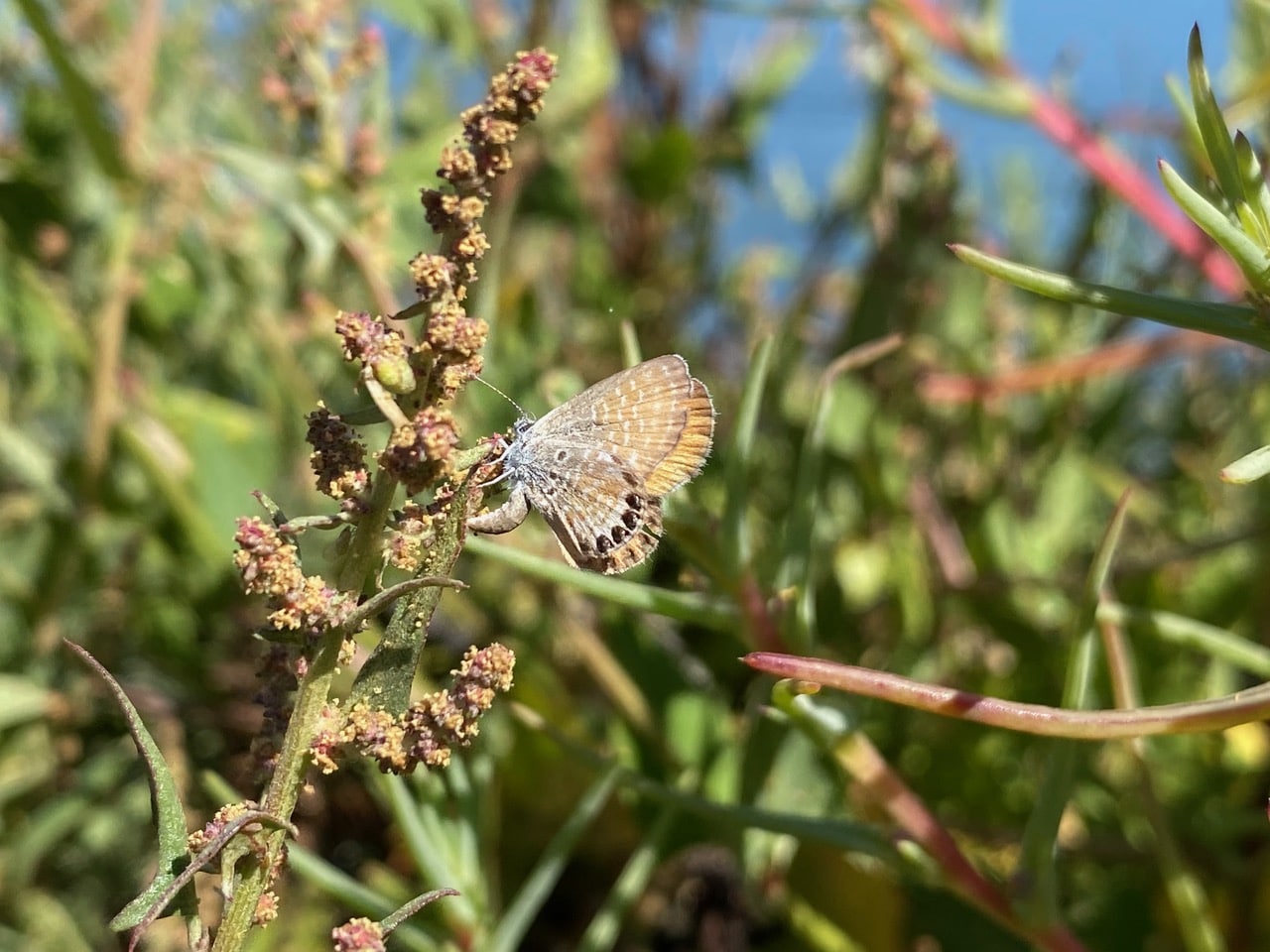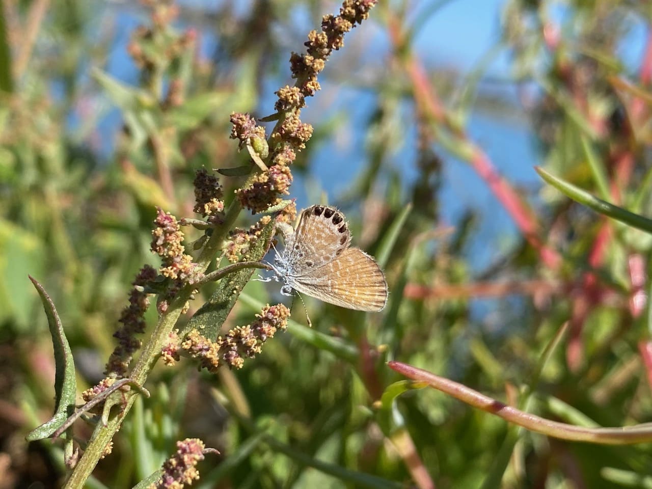 The little butterfly lays her eggs among the clusters of tiny flowers from the top of the spike to the bottom. I am glad to be able to see the underside of her wings.