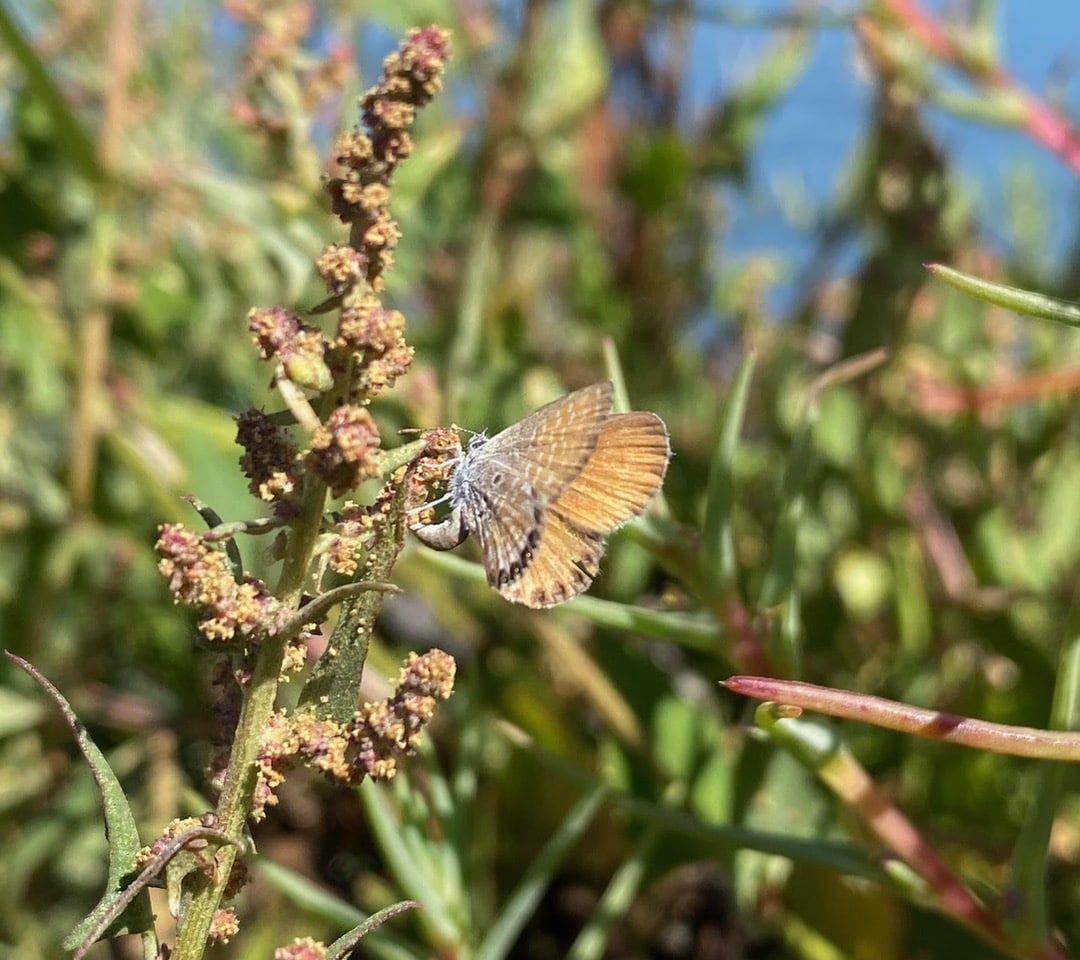 With a wingspan of 12-20 mm, about the size of a thumbnail, the Western Pygmy Blue, Brephidium exilis (family Lycaenidae) is one of the smallest butterflies in the world and the smallest in North America. The butterfly is found in alkaline areas such as deserts and salt marshes. The caterpillars feed on plants in the Goosefoot family Chenopodiaceae, commonly found in salty habitats. Although the species has no set breeding season, mating activity is at its peak during late summer and early fall.