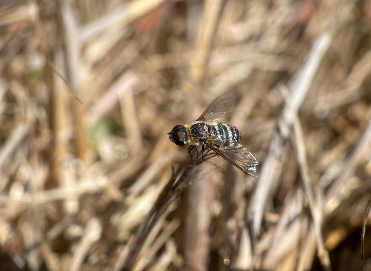 A Bee Fly, Villa sp. (family Bombyliidae) has landed on a twig among the dried grass on the ground.The Bee Flies belong to the family Bombyliidae. Adults generally visit flowers for nectar and pollen, some being important pollinators. Larvae generally are parasitoids of other insects. When at rest, many species of bee flies hold their wings at a characteristic “swept back” angle. The adult females usually deposit eggs in the vicinity of possible hosts, quite often in the burrows of beetles or ground-nesting bees/wasps. Bombyliidae parasitism is not host-specific, but rather opportunistic, using a variety of hosts. Adult females of the genus Villa lay eggs in mid-air and flick them towards the nest entrances of their hosts. They typically have an eversible pouch near the tip of their abdomen known as a sand chamber, which is filled with sand grains gathered before egg laying. These sand grains are used to coat each egg just before their aerial release, presumably to improve the female’s aim by adding weight.