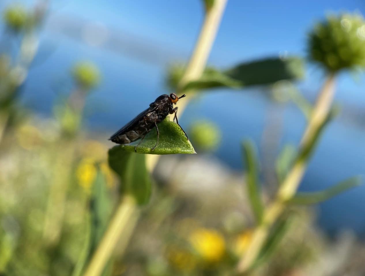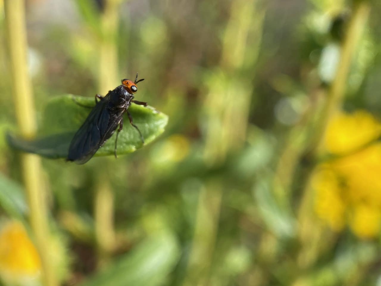 A black fly with tiny red head and black eyes is perched on a Grindelia leaf. iNaturalist has identified it as Sugarcane Soldier Fly (family Stratiomyidae).