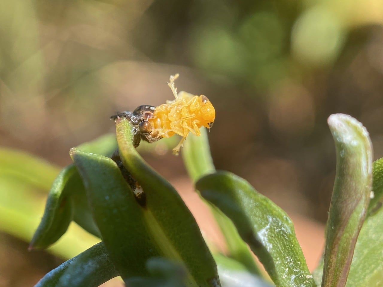 A teneral Spittlebug is resting next to its foam shelter. A teneral insect is one that has recently molted and its exoskeleton is yet to harden and get its final coloration. In this state the insect is very vulnerable. The teneral state can last for some time.