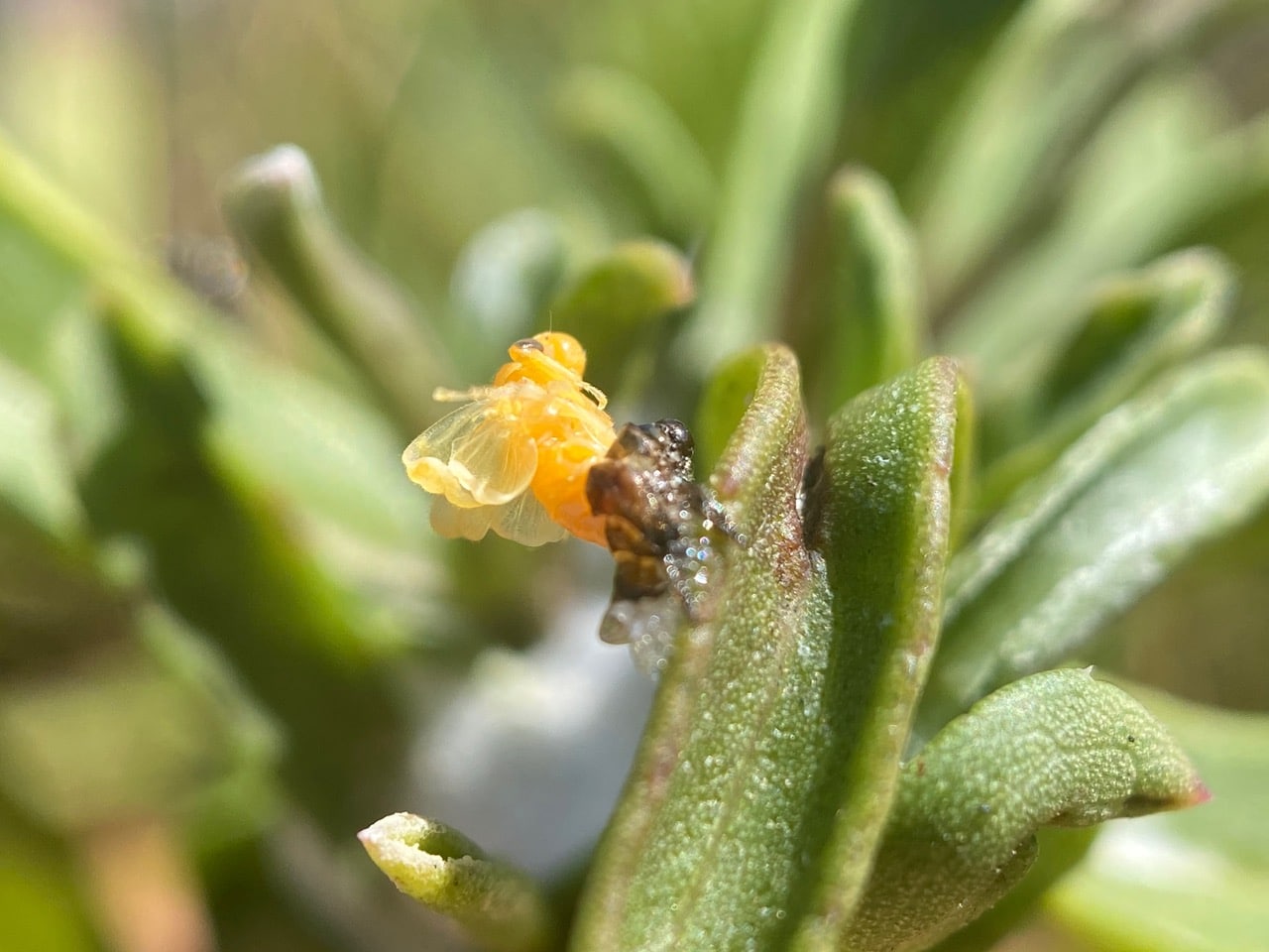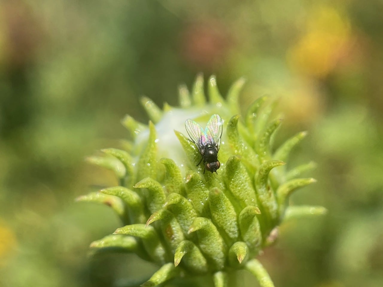 Barely a speck to the naked eye, a tiny fly is perched on an immature Grindelia flowerhead. Is it a Leaf-miner Fly in the genus Ophiomyia (family Agromyzidae)?