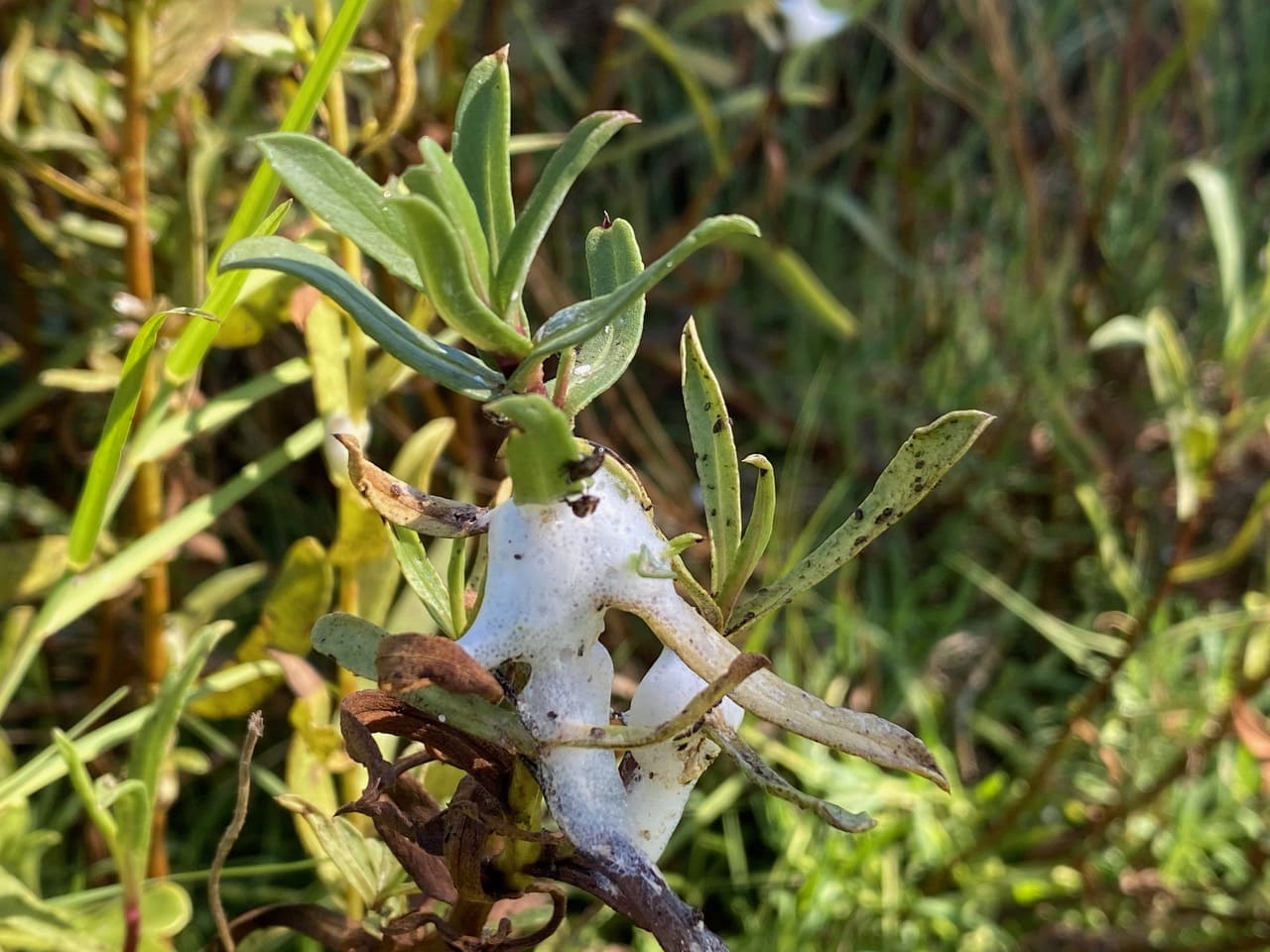 This poor Grindelia is infested with both Spittlebugs and Lace Bugs.